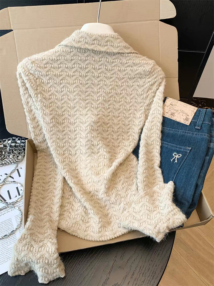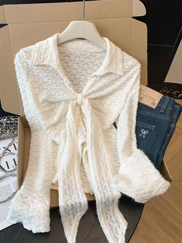 Jade 美拉德甜美风系带翻领镂空长袖 针织小衫 女 Closet直营店推荐
