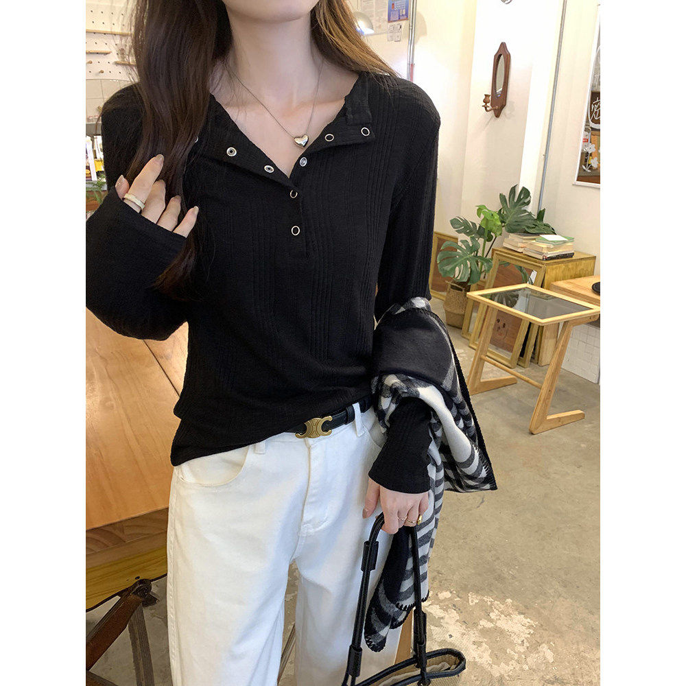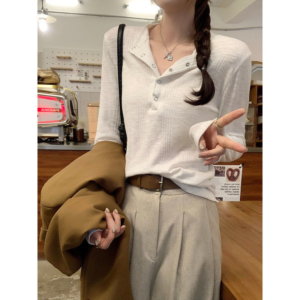 打底衫 内搭温柔风上衣ins T恤女2026春季 极简通勤简约暗扣坑条长袖由