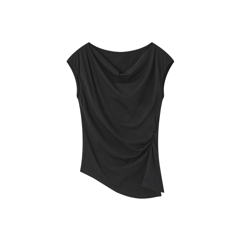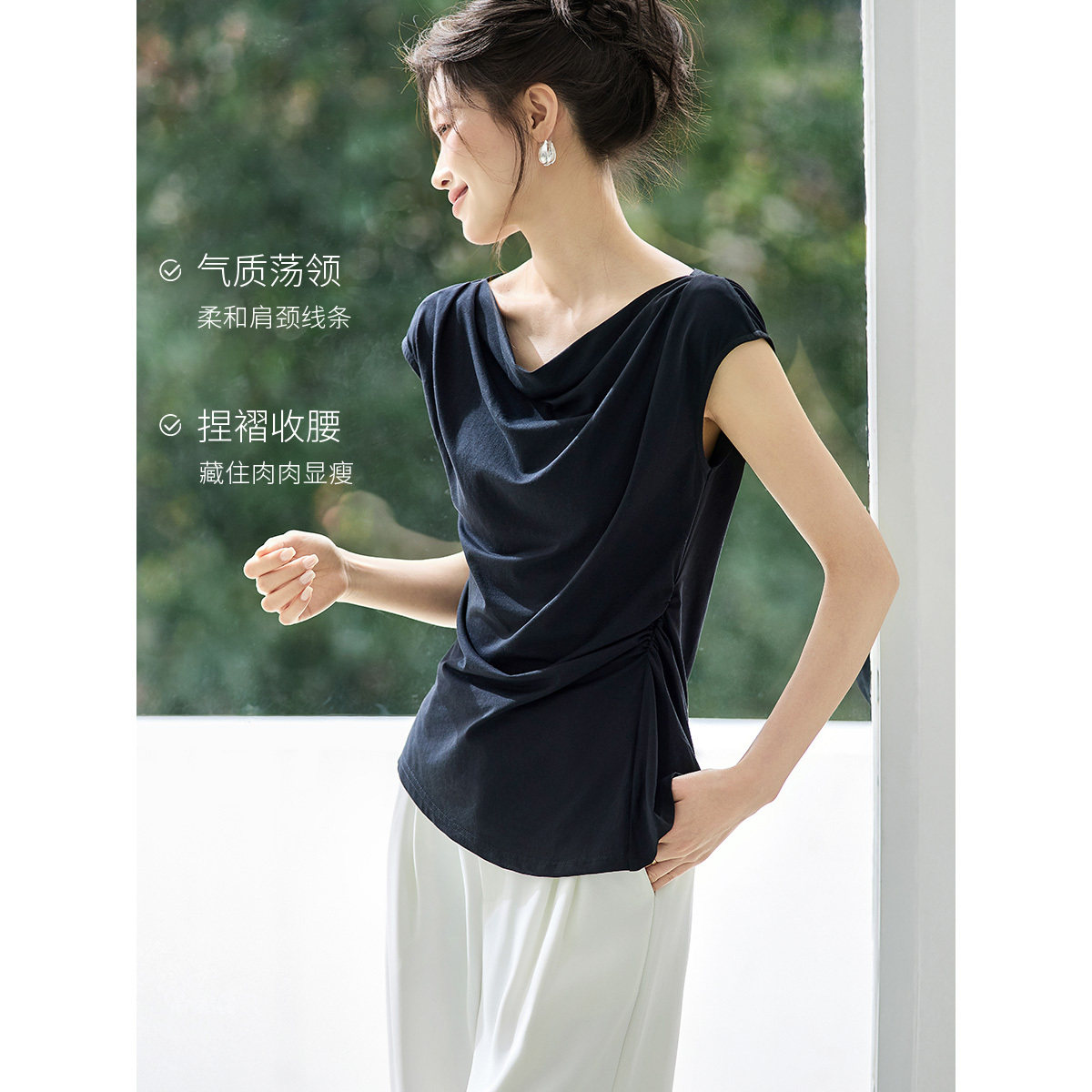 沫晗依美莱赛尔不对称短袖 一字领收腰显瘦抽褶百搭T恤女 26夏新款