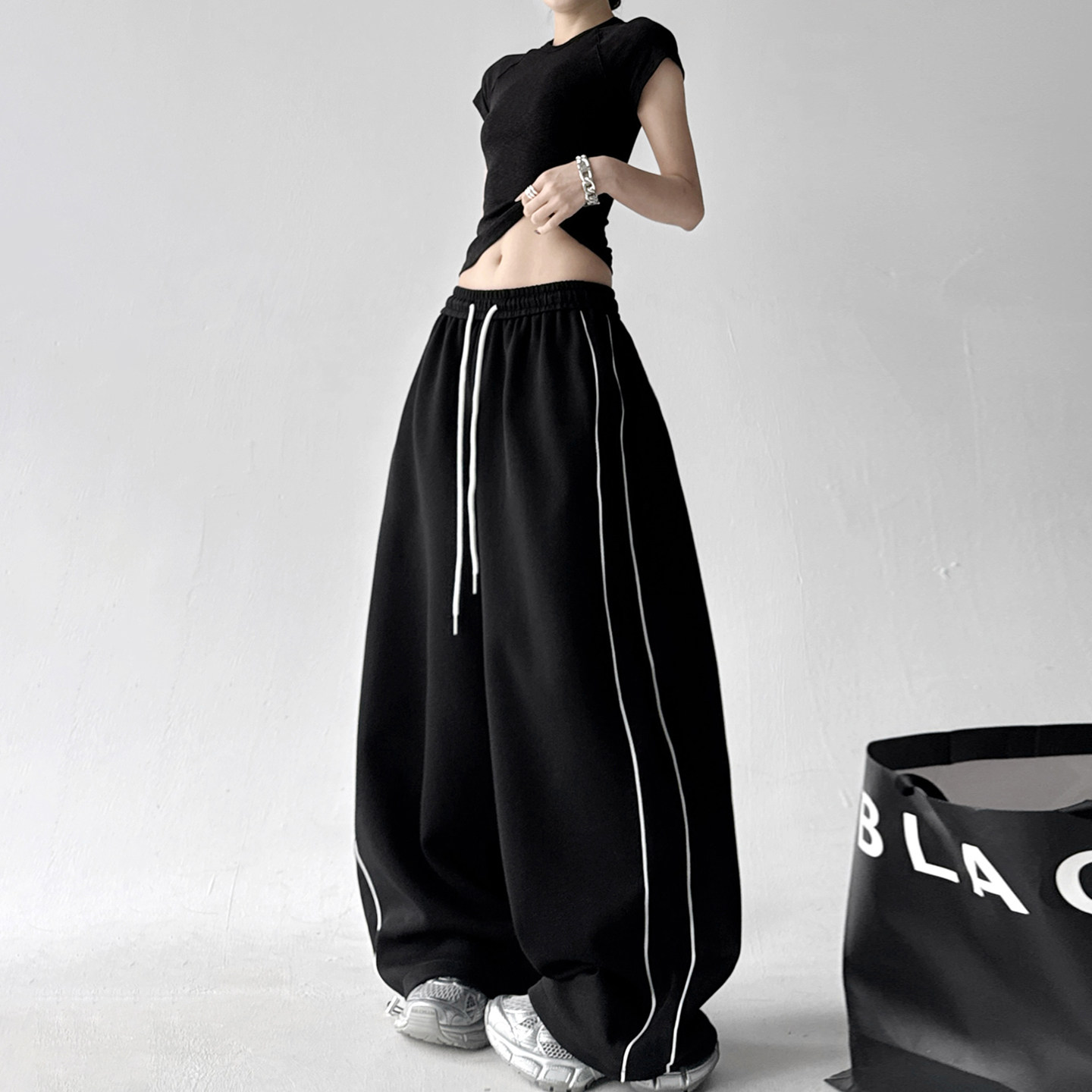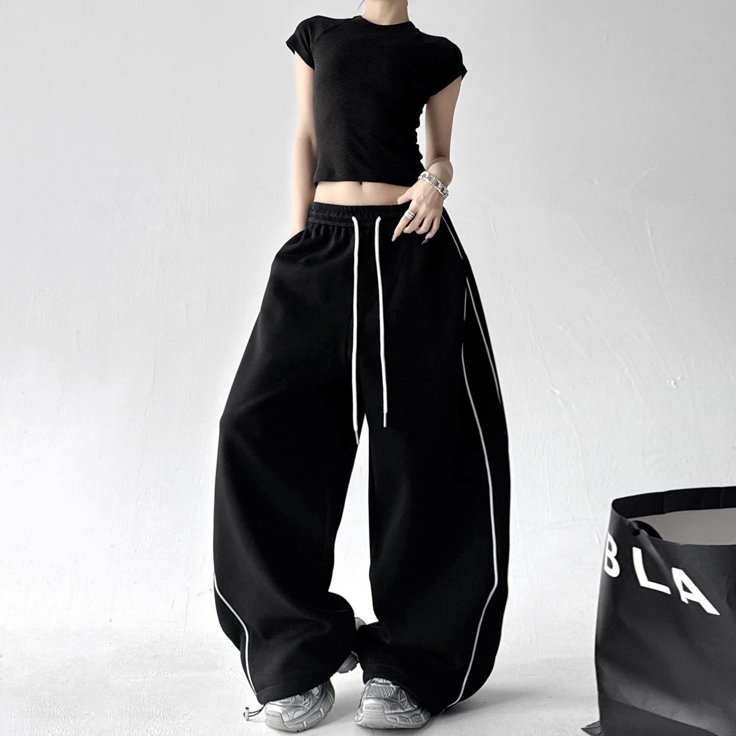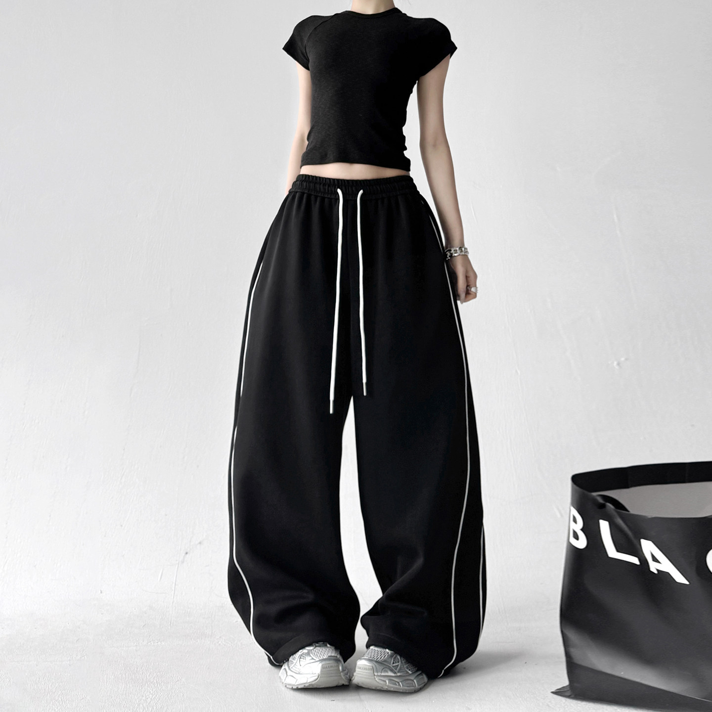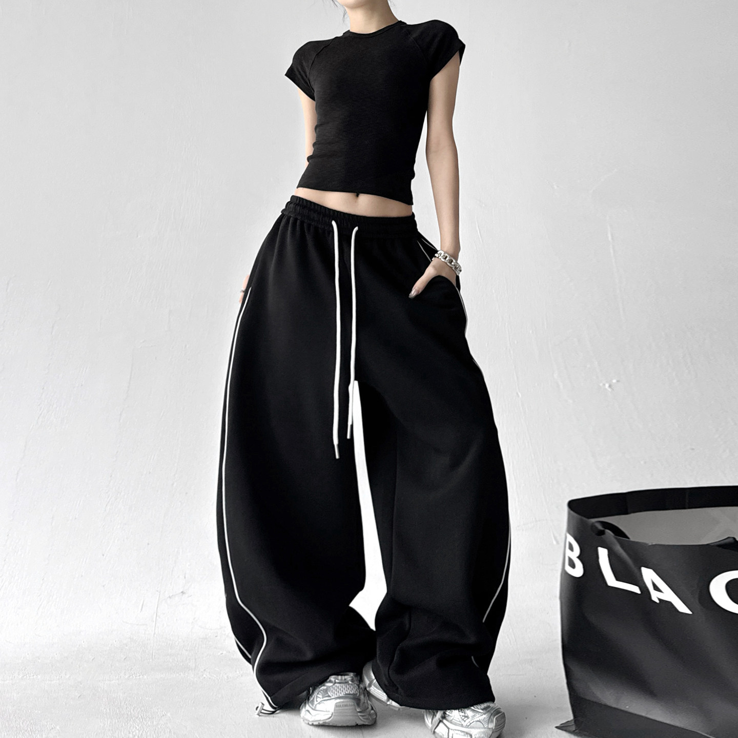 宽松显瘦抽绳运动裤 黑色阔腿裤 女2026春秋季 新款 子 休闲慵懒风长裤