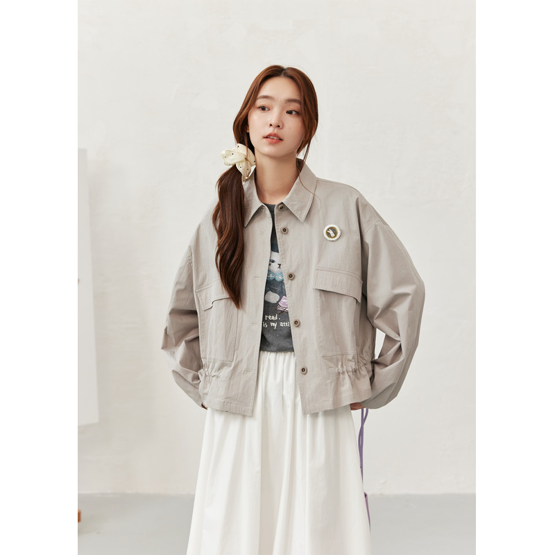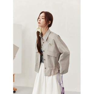 新款 紫涵短款 翻领衬衫 外套女2026春季 风下摆抽绳宽松上衣 简约工装