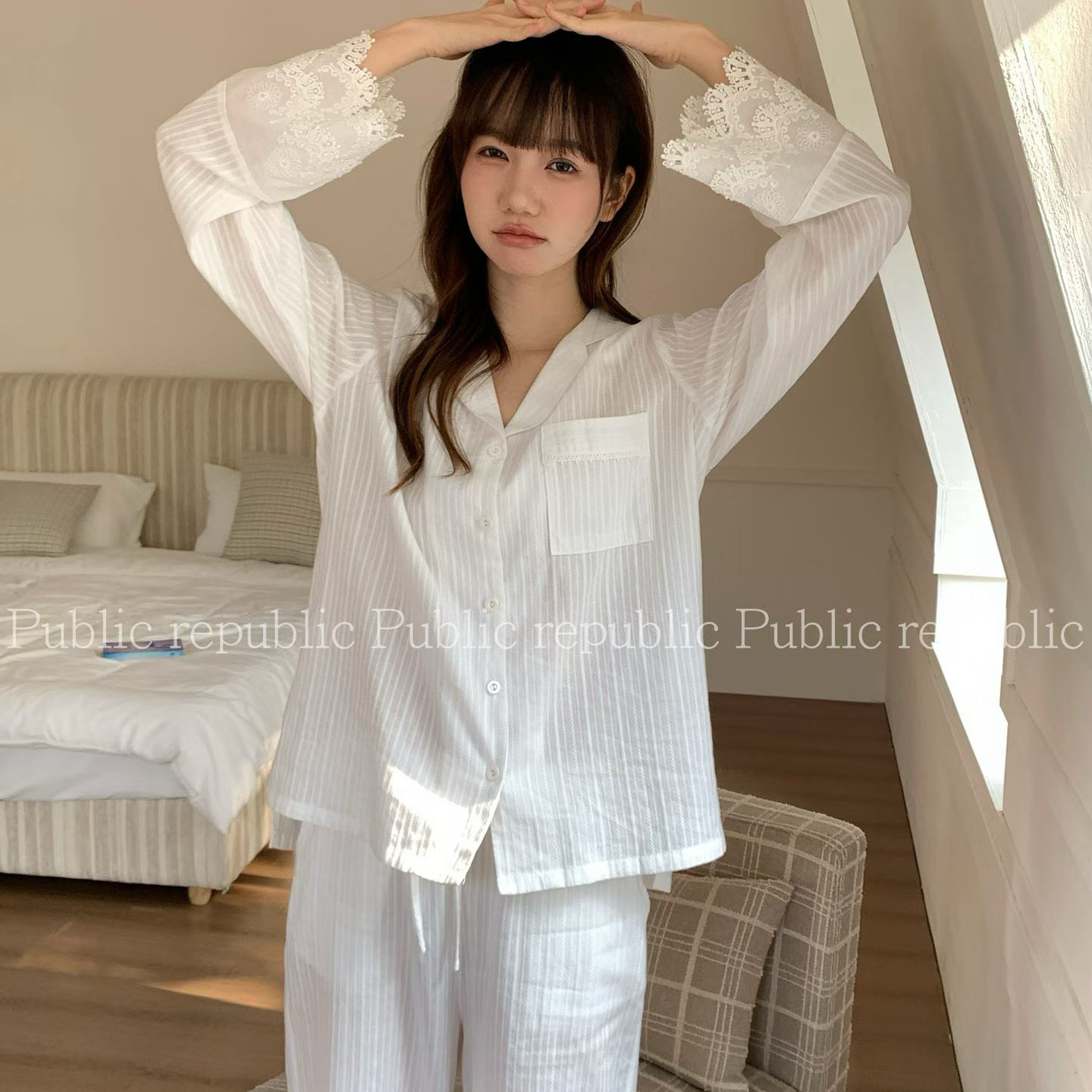 纯棉简约甜美刺绣蕾丝花边开衫 家居服女 republic韩国春季 Public由
