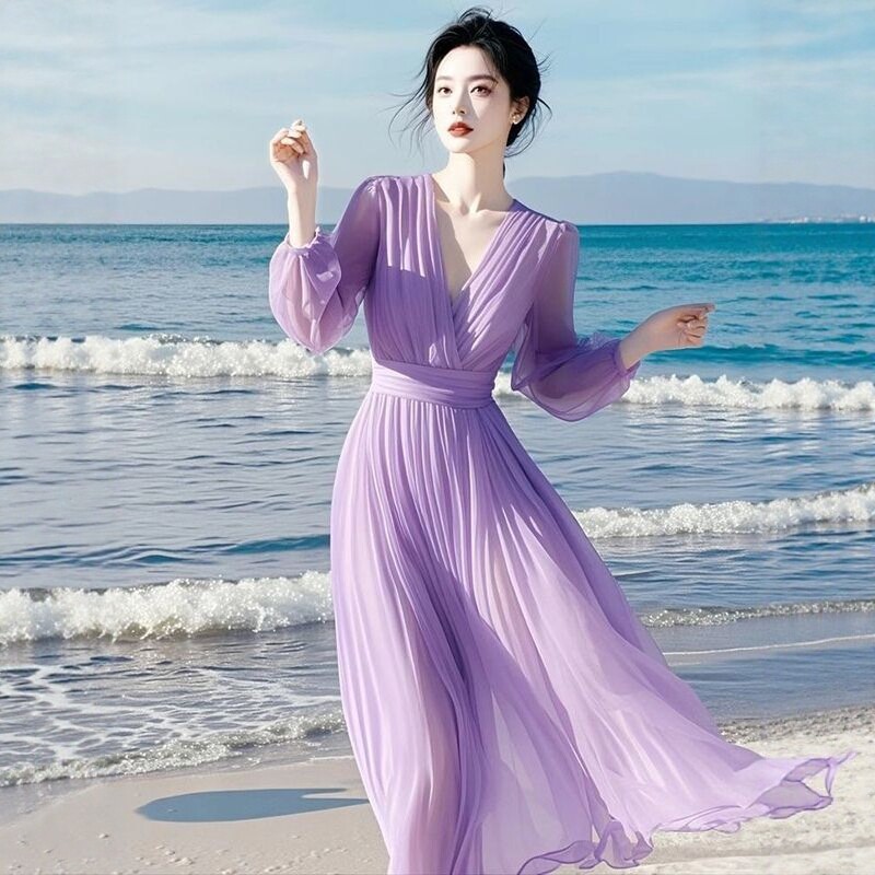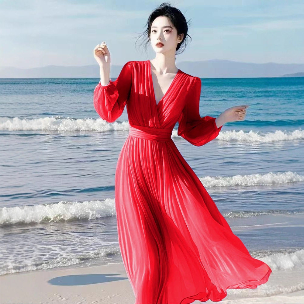 春夏新款 飘逸垂感显瘦高腰大摆旅游海边度假长裙 雪纺连衣裙女长袖