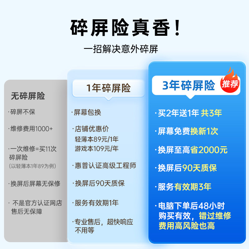 光影精灵暗影精灵星Book星Book Pro可用 可选3年碎屏免费换新1次 惠普笔记本电脑屏险