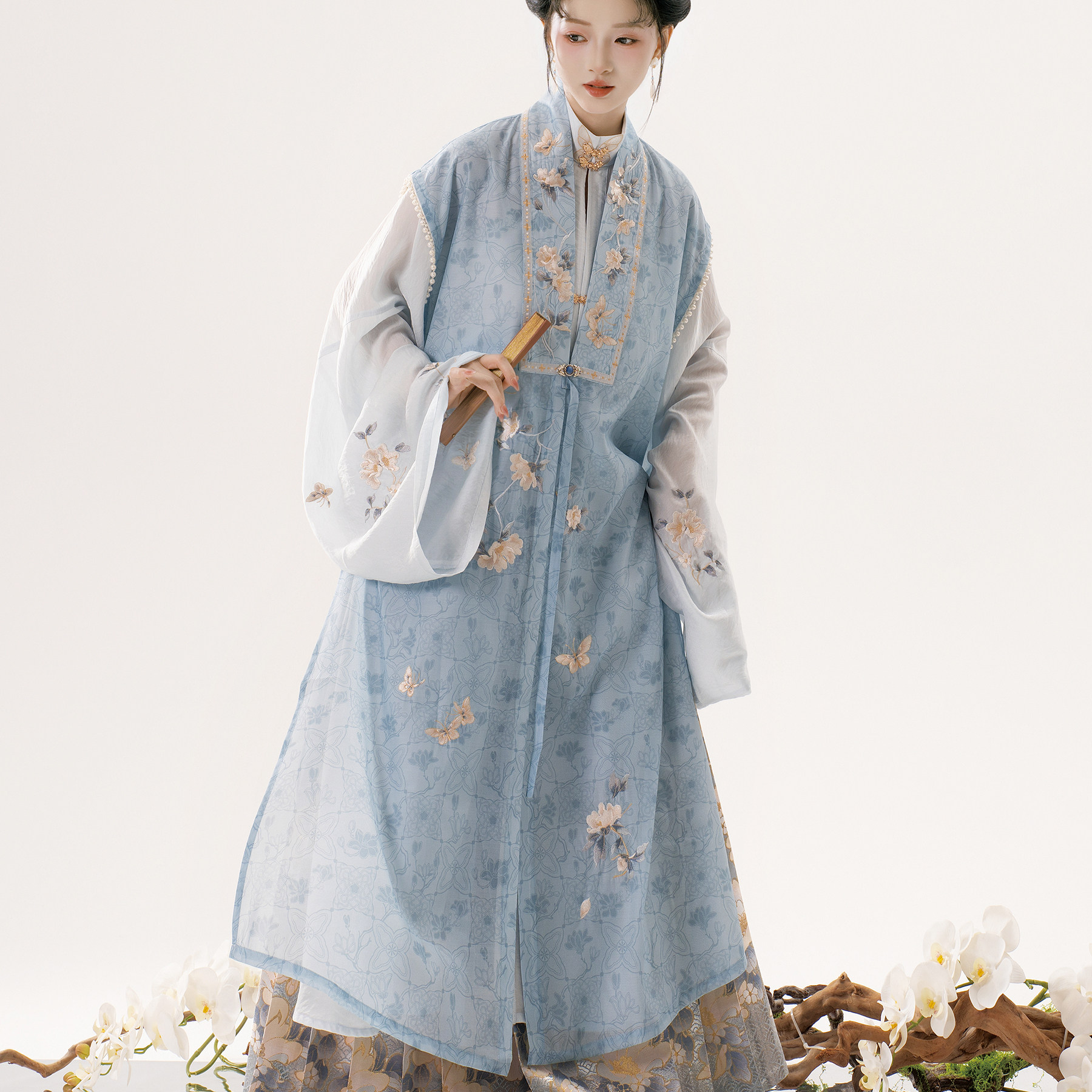 为您提供商品新款 马面裙 白茶清欢宋制原创明制汉服中国风蓝包肩长比甲立领长衫的详细介绍,