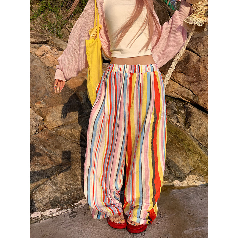 NECOYEP 复古彩虹条纹松紧腰阔腿休闲裤 男女宽松百搭拖地长裤 美式由