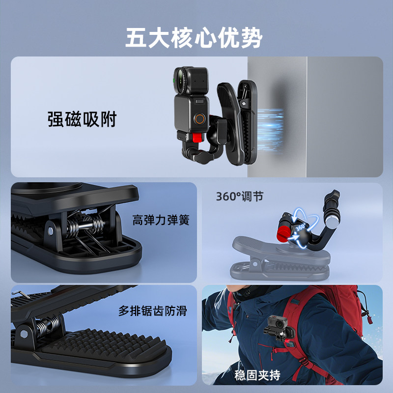 为您提供商品Flymile适用大疆Acton6 4磁吸背包夹肩带夹运动相机nano osmo 360万向旋转书包夹第一视角拍摄固定支架 5Pro的详细介绍,