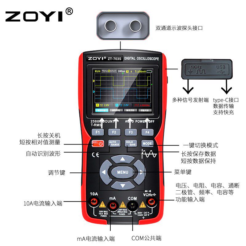 703s双通道示波器50MHz高精度多功能三合一万用表汽修 众仪彩屏ZT由