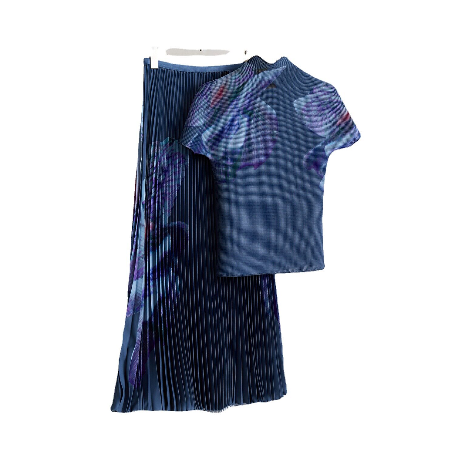 洋气高端花卉褶皱上衣短袖 女优雅气质百褶裙T恤两件套 半身裙套装由