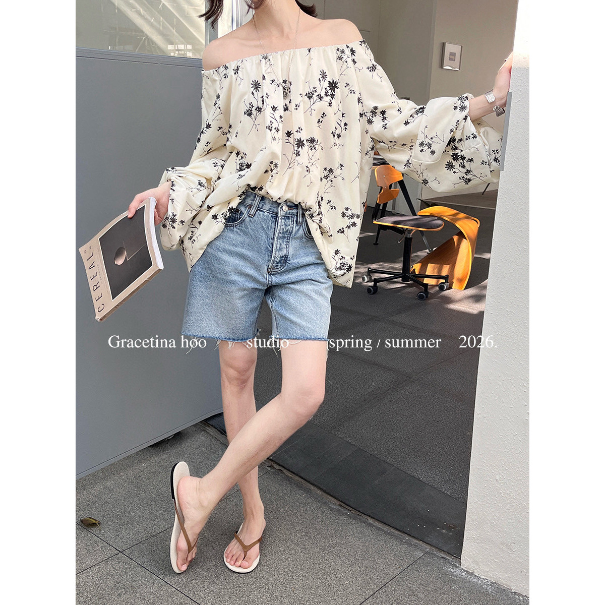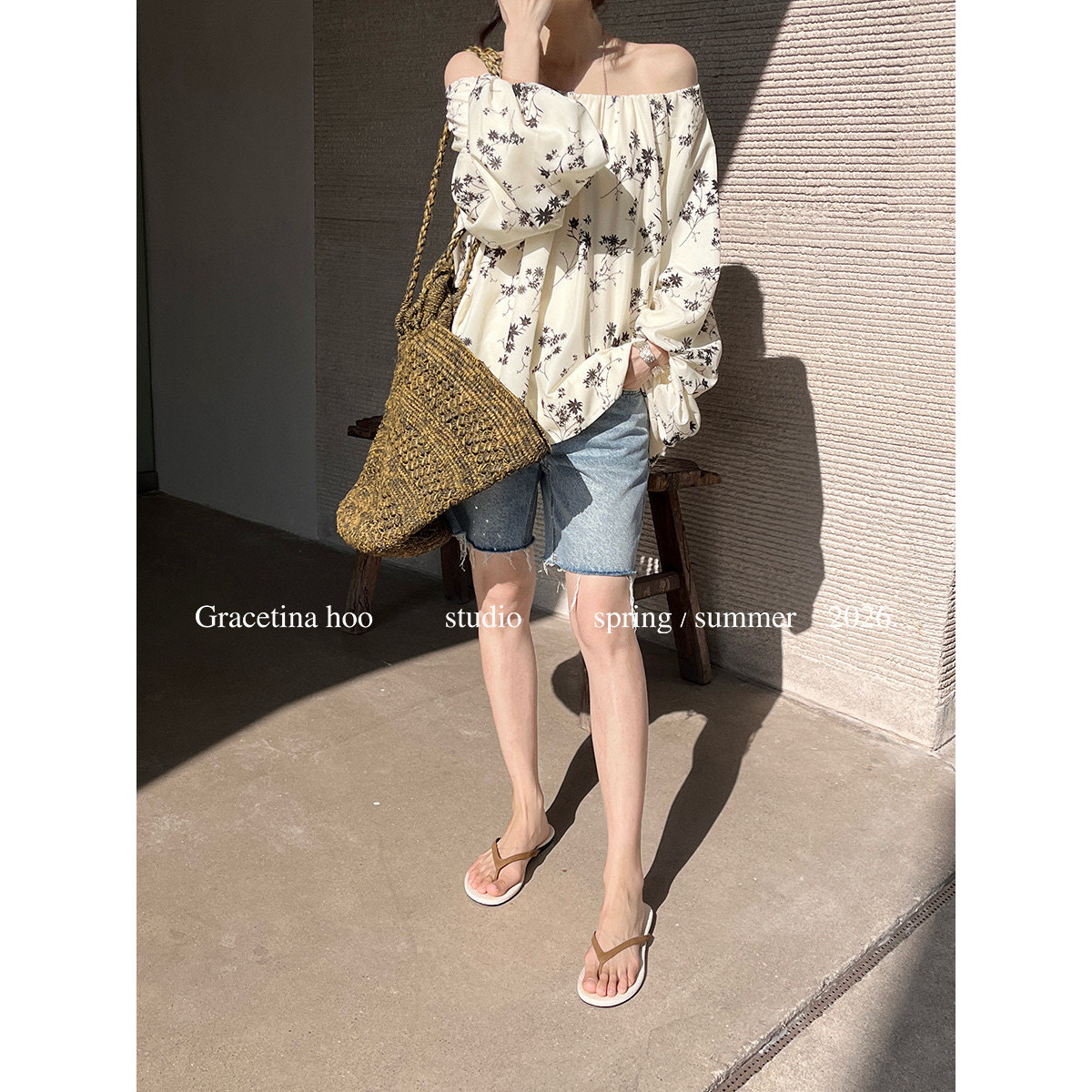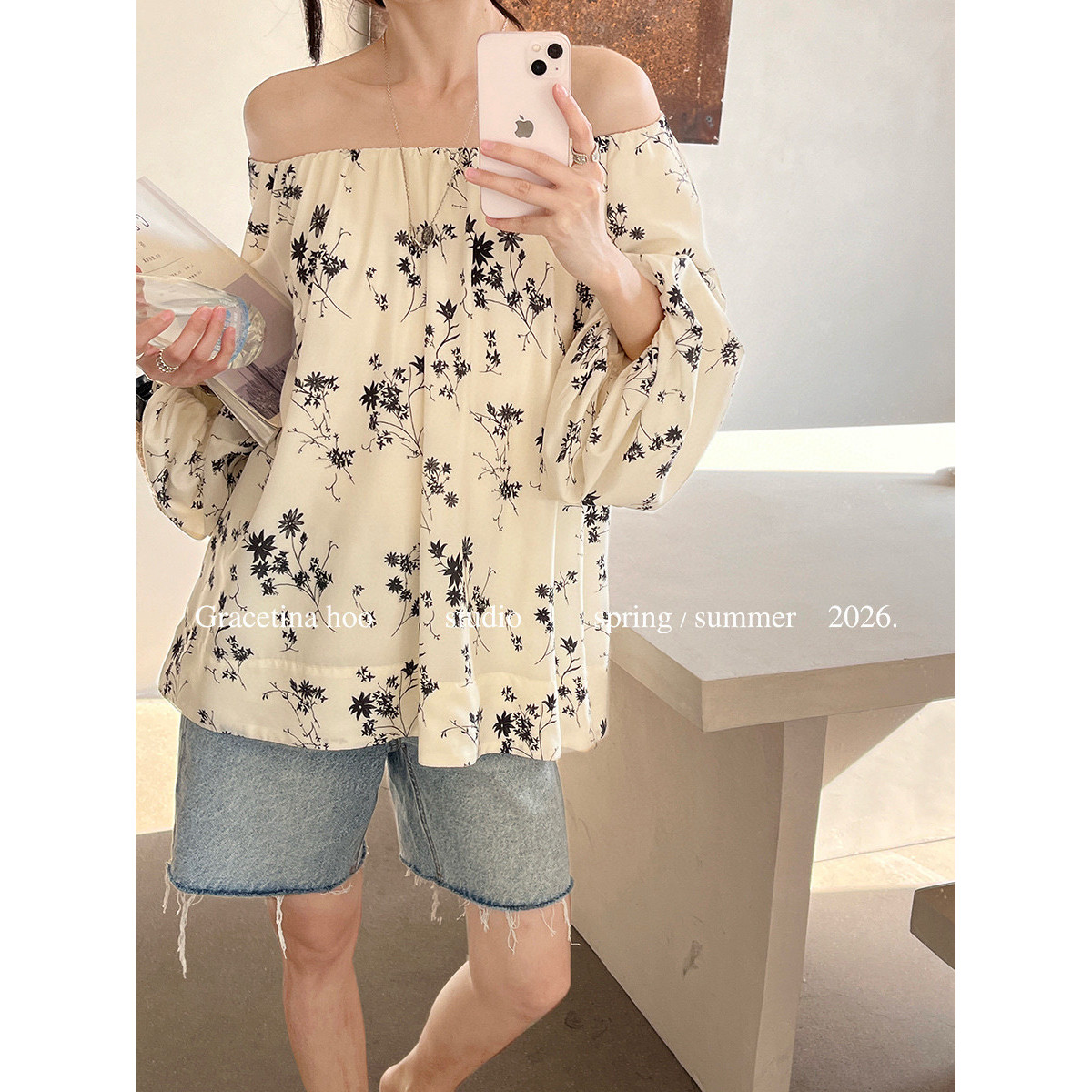 浪漫花卉马蹄袖 GRACETINA HOO 定染法式 CSA078 慵懒随性一字肩衬衫由