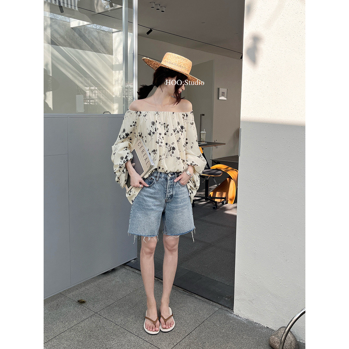 浪漫花卉马蹄袖 GRACETINA HOO 定染法式 CSA078 慵懒随性一字肩衬衫