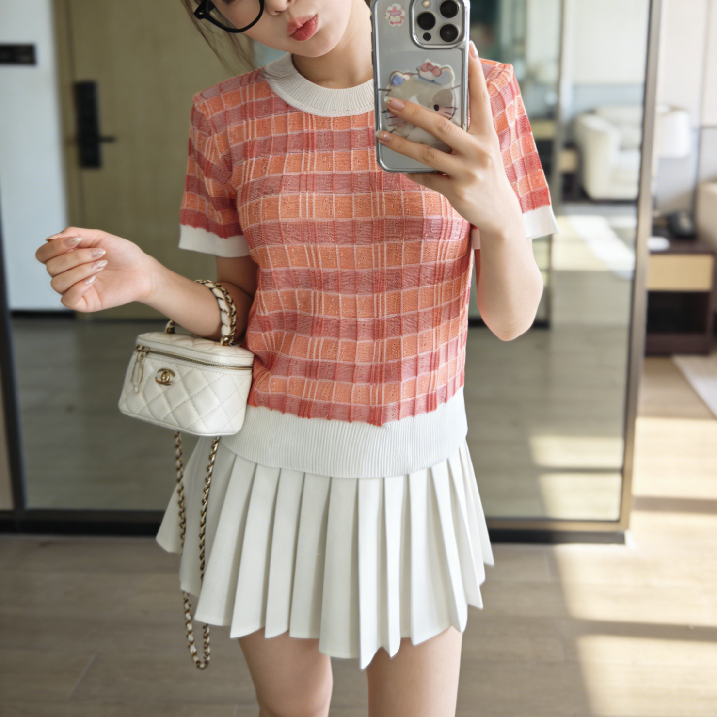 为您提供商品韩系气质撞色领短袖 薄款 冰丝针织修身 减龄通勤上衣 T恤女圆领夏季的详细介绍,