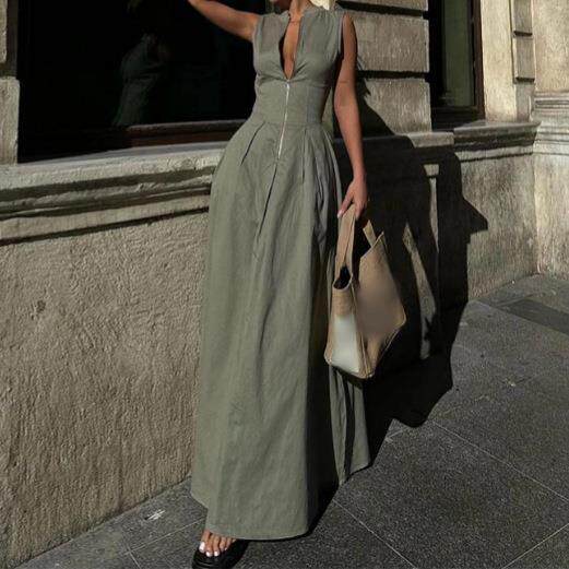 Dress Women Neck V领收腰气质长裙休闲百搭连衣裙 无袖由