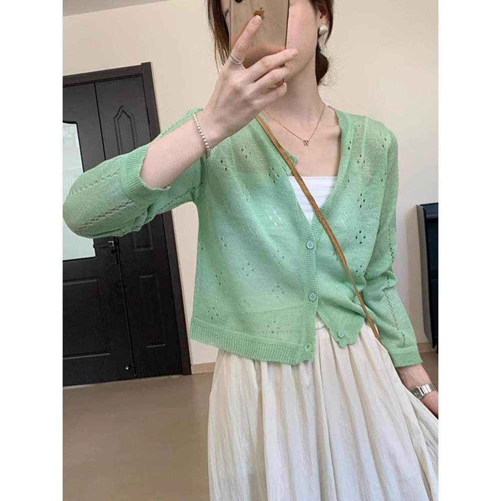 春夏奶黄色小香风防晒镂空针织开衫 0329z 女早秋小个子温柔短款
