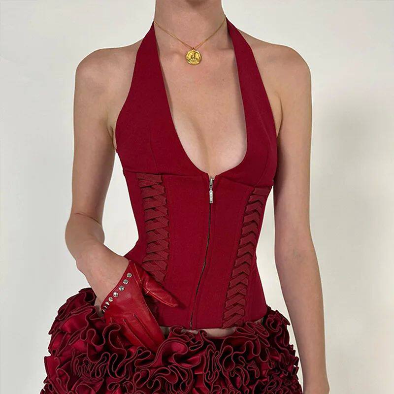 Neck 挂脖深V绑带收腰显瘦背心上衣Waist Tie Halter Top Crop