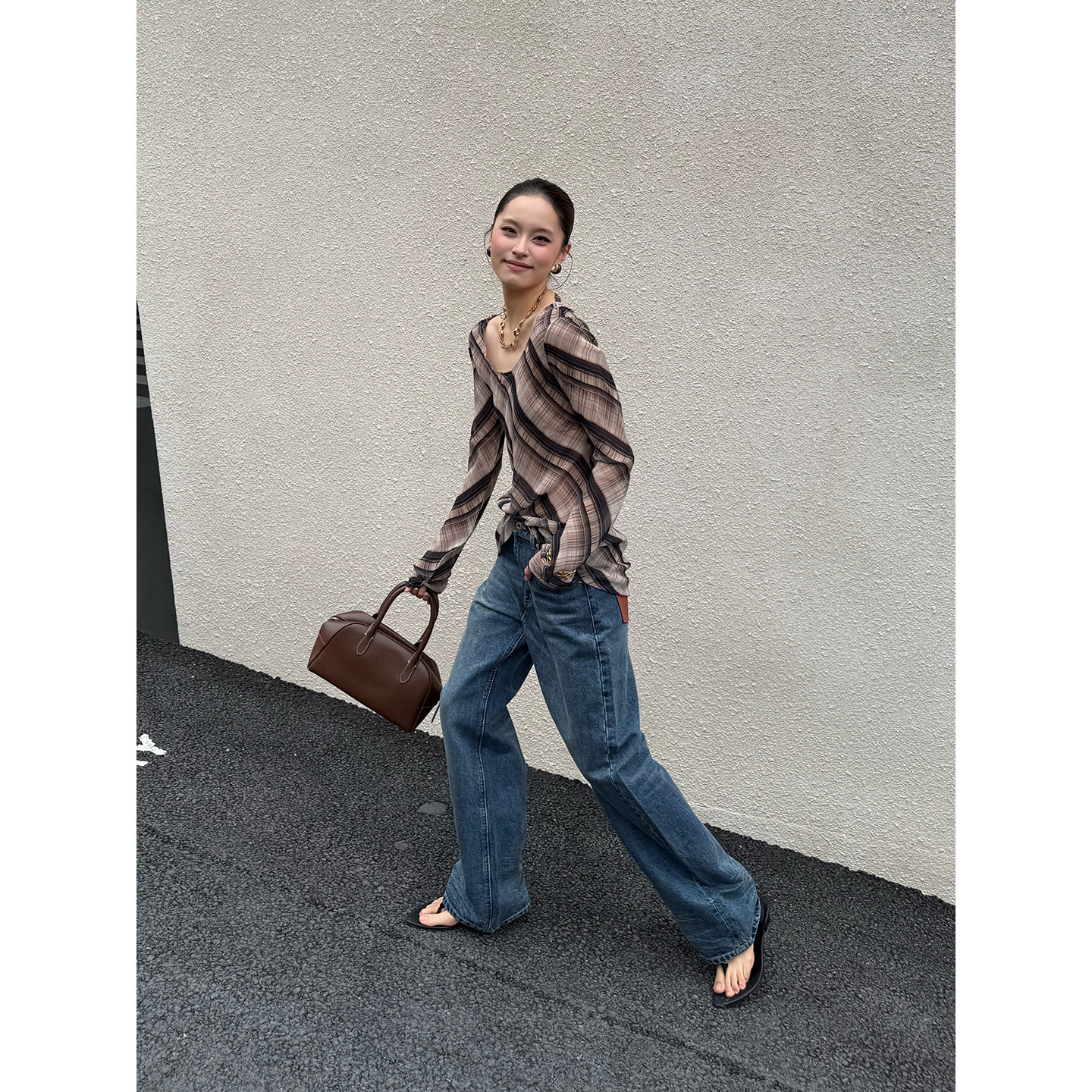 橘子树在哪儿复古卡其色拼接牛仔裤 子 女春秋设计感直筒阔腿垂感裤