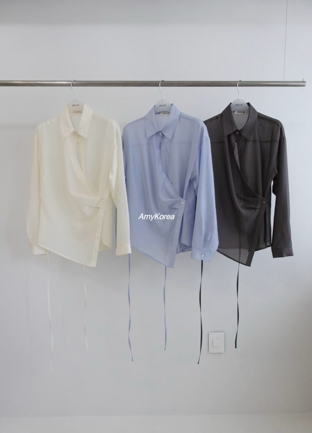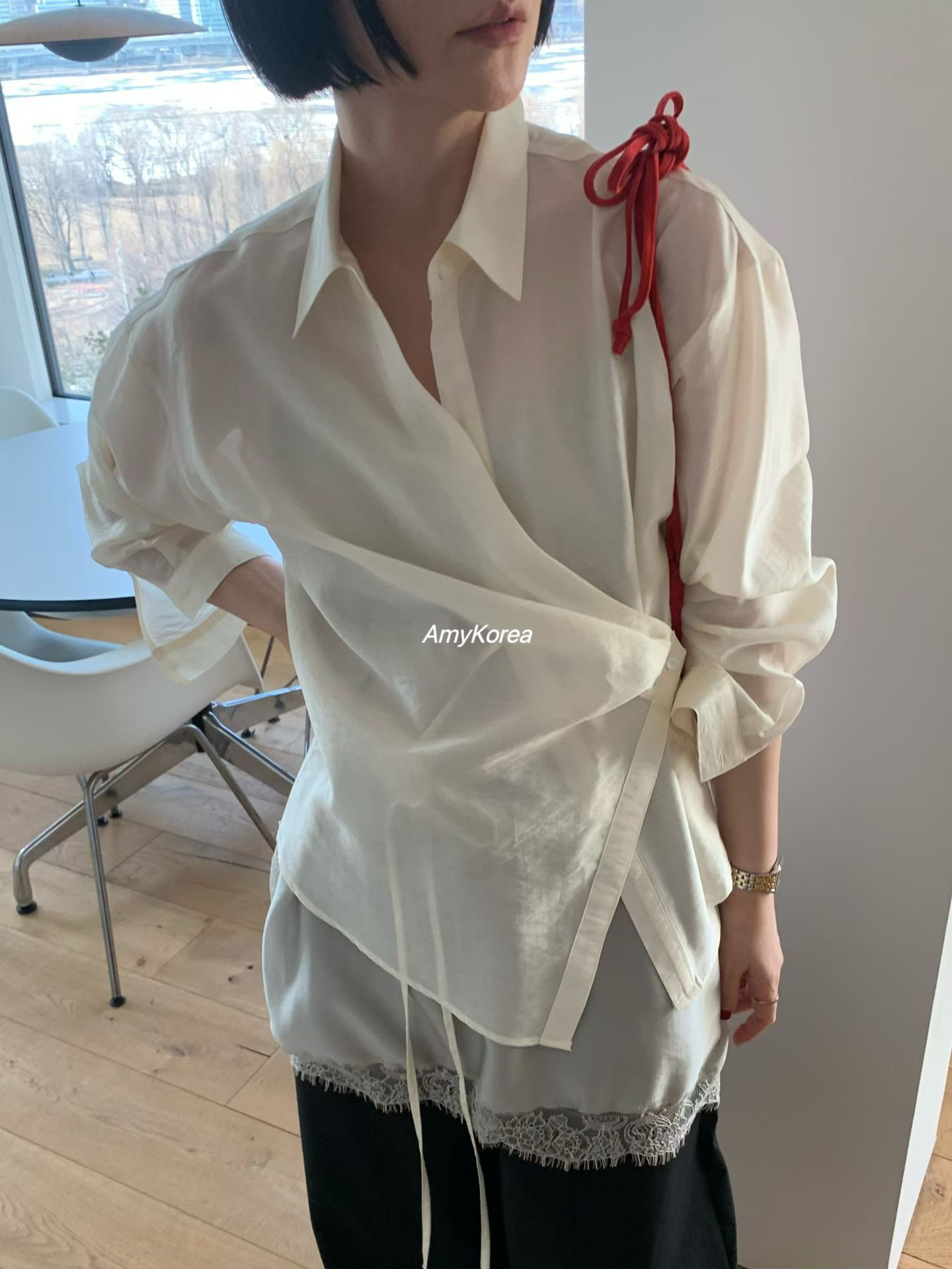 东大门 26早春 Amy韩代 收腰纯色百搭 长袖 衬衫 系带侧系扣 awear