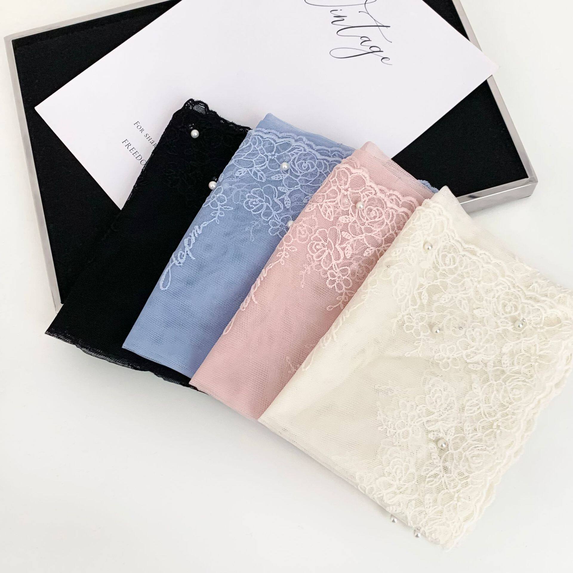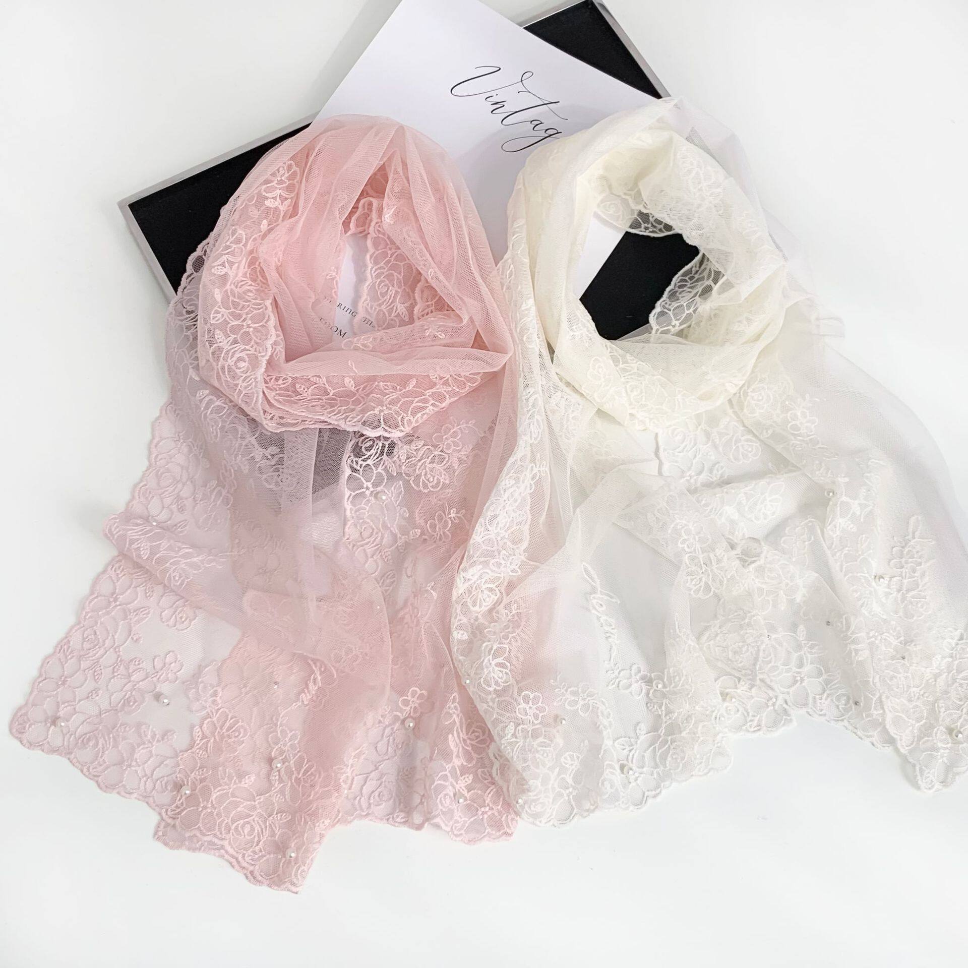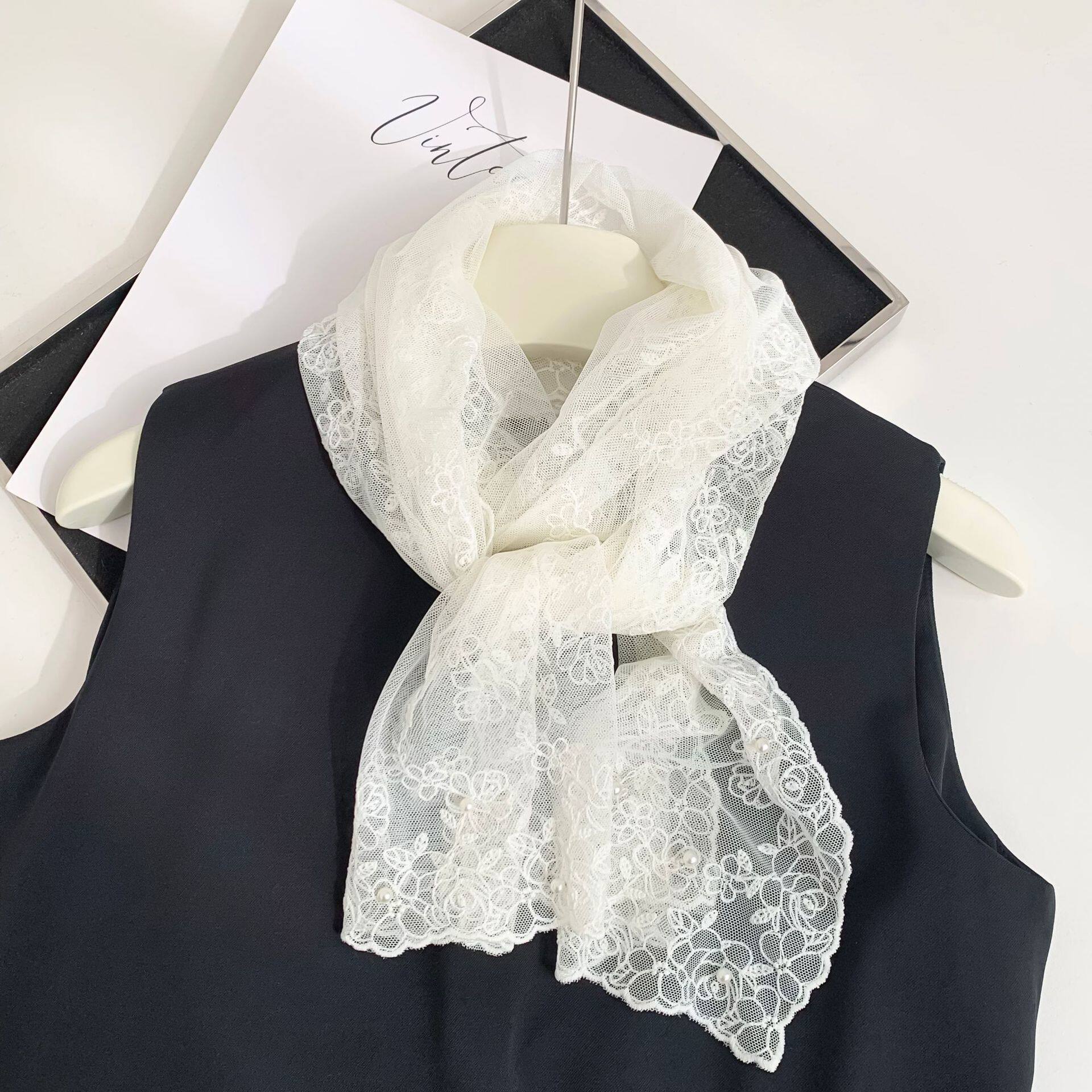 围巾丝巾绣花珍珠蕾丝网纱丝巾韩版 饰领巾 百搭文艺白色蕾丝头巾装