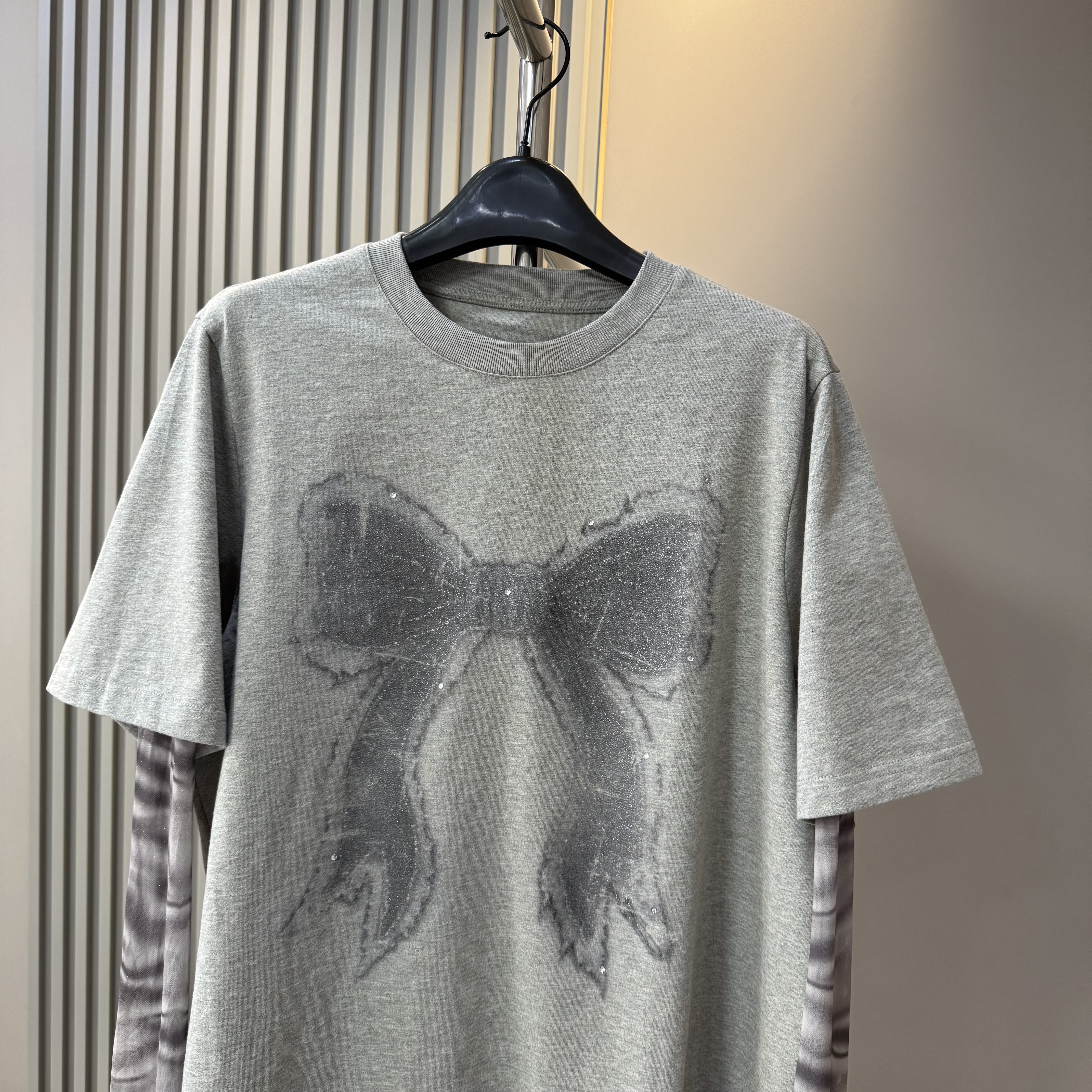 欧货新款 蝴蝶结图案网纱拼接长袖 T恤女 春夏宽松上衣 甜美少女