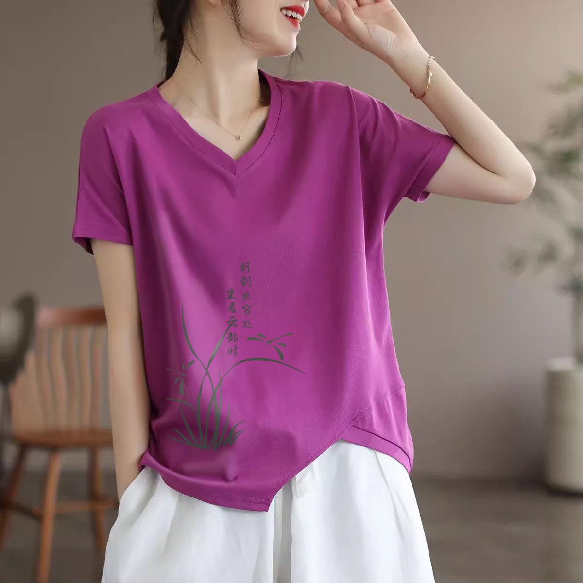 外贸出口清仓夏季 t恤女休闲时尚 宽松V领半袖 上衣 100%纯棉气质短袖由