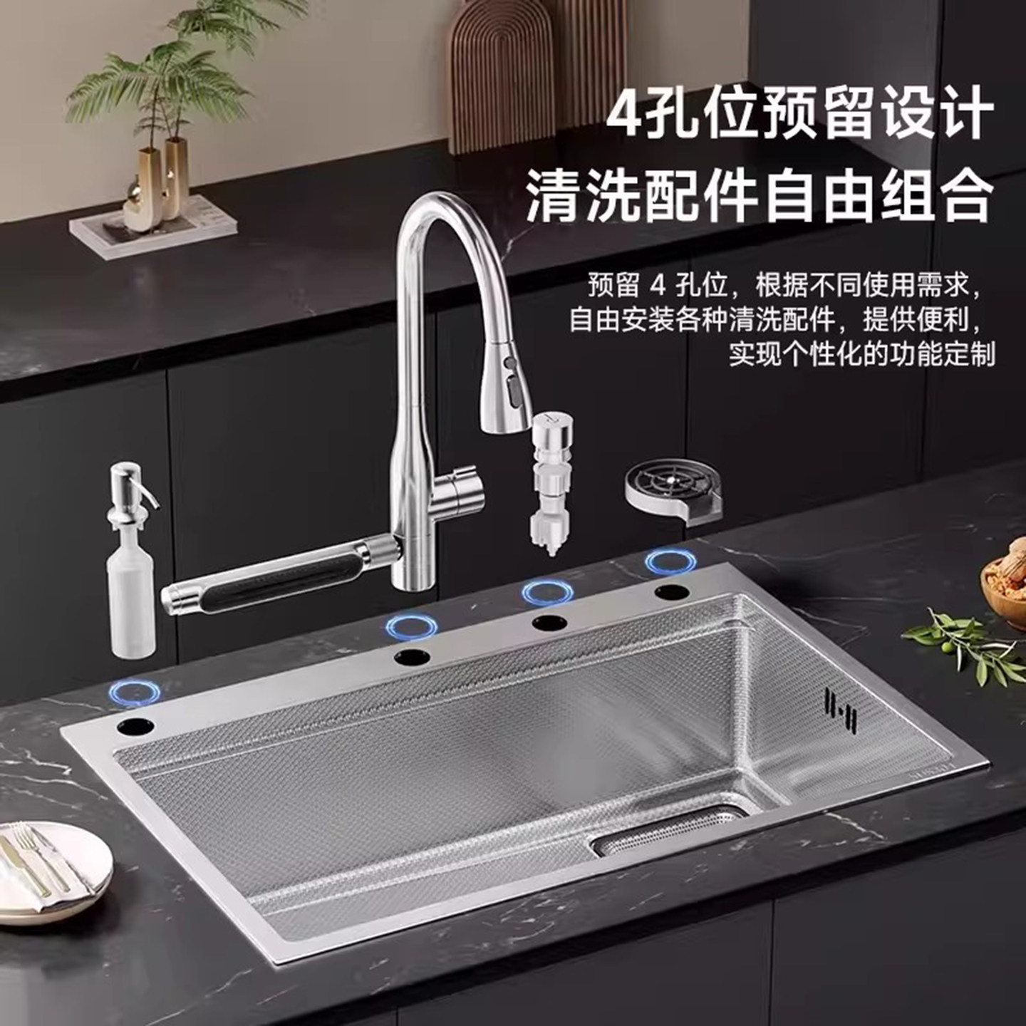悍高厨房纳米水槽手工单槽304不锈钢灰色洗菜盆洗碗盆大单盆套餐