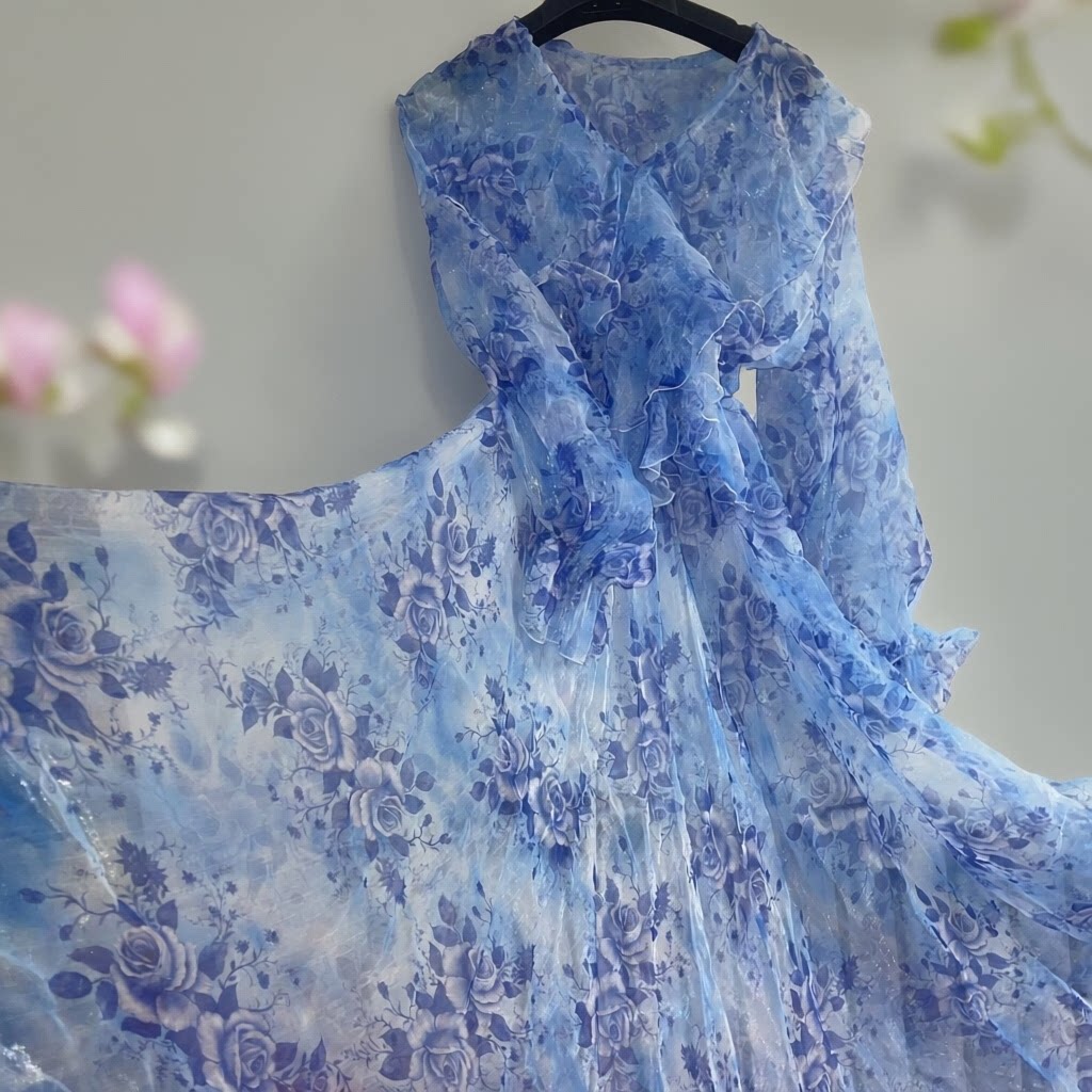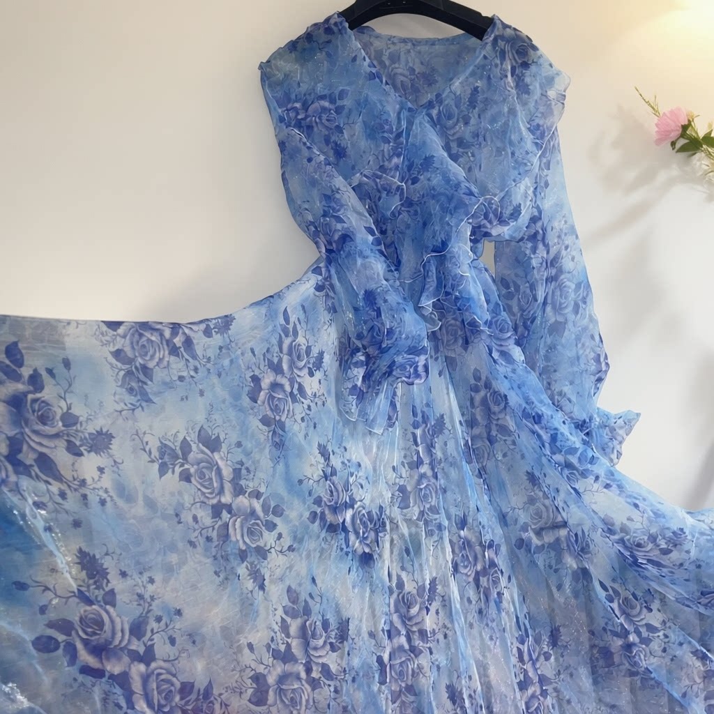 宴会主持年会礼服2025春秋蝴蝶结飘带波点印花木耳波浪连衣裙 晚装