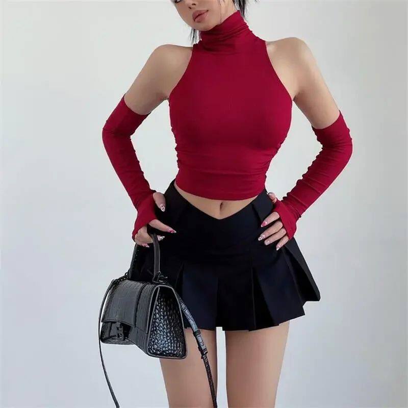 cropped 辣妹高领背心套袖 top neck high 修身 露脐上衣Bodycon