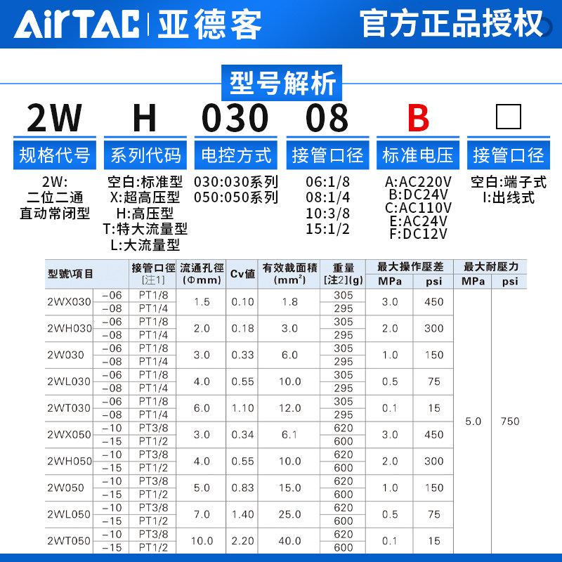 为您提供商品15高压型水阀AC220 亚德客流体电磁阀2WH030 DC24V 050的详细介绍,