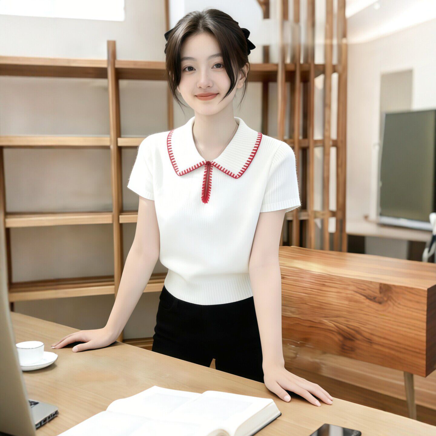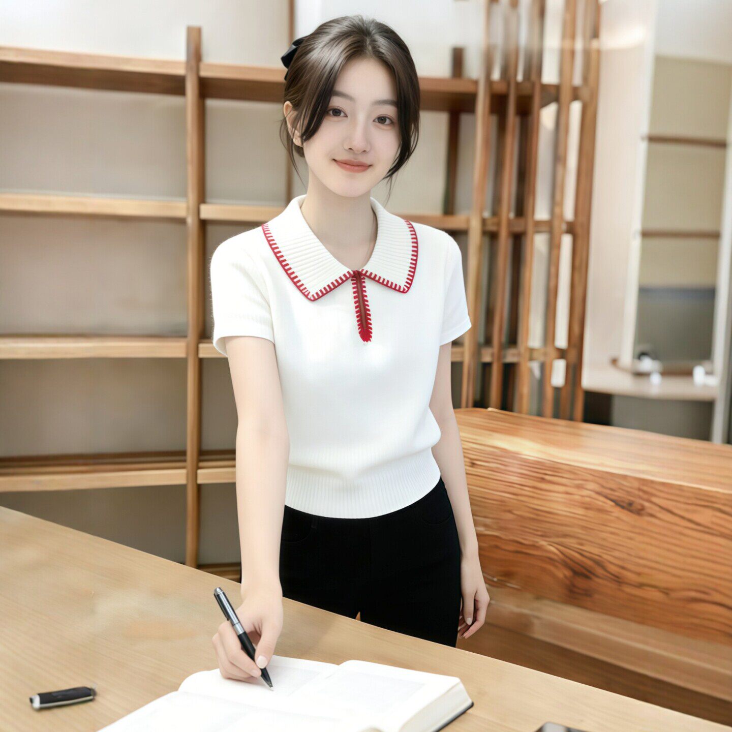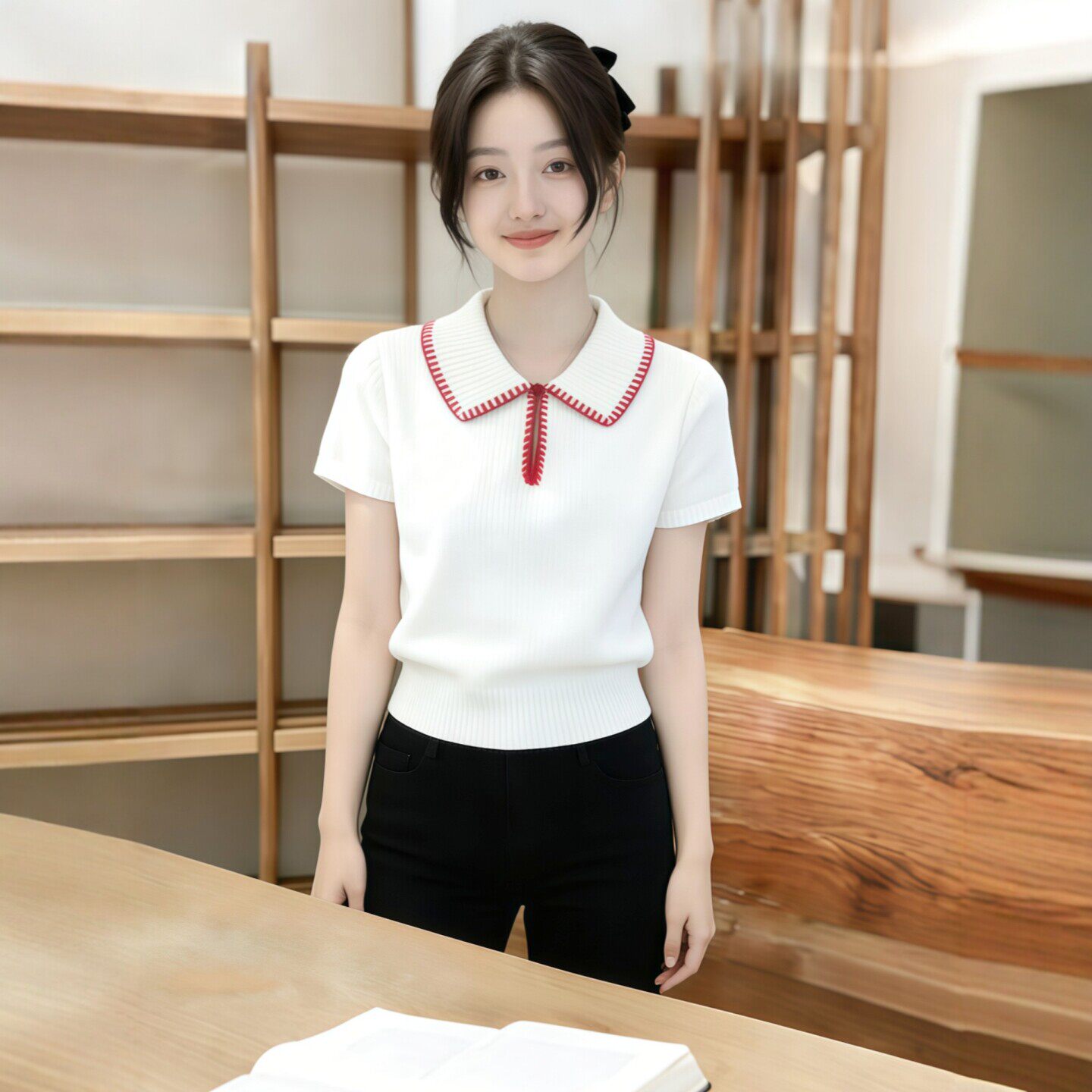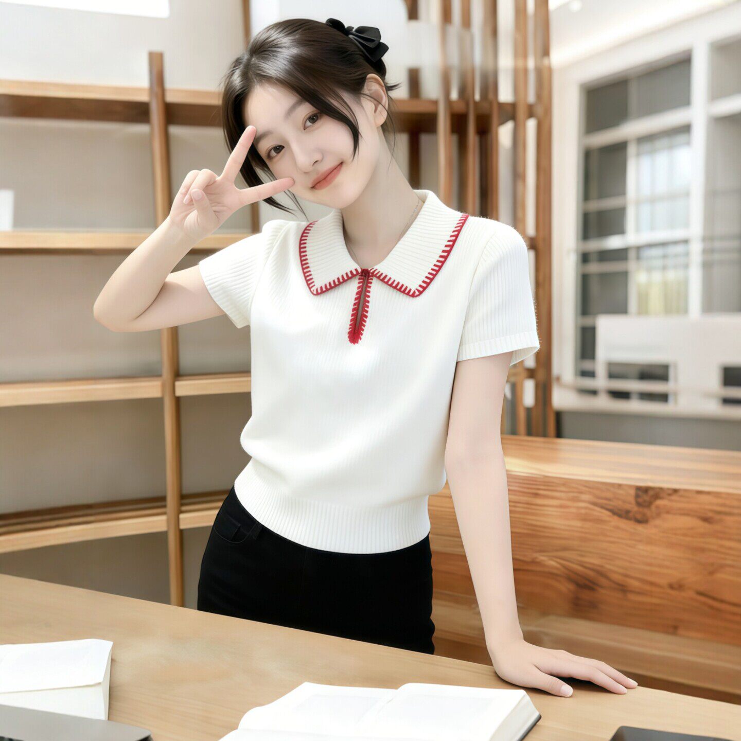 春装 白色polo领短袖 针织衫 女装 设计感撞色早春气质上衣服 2026新款