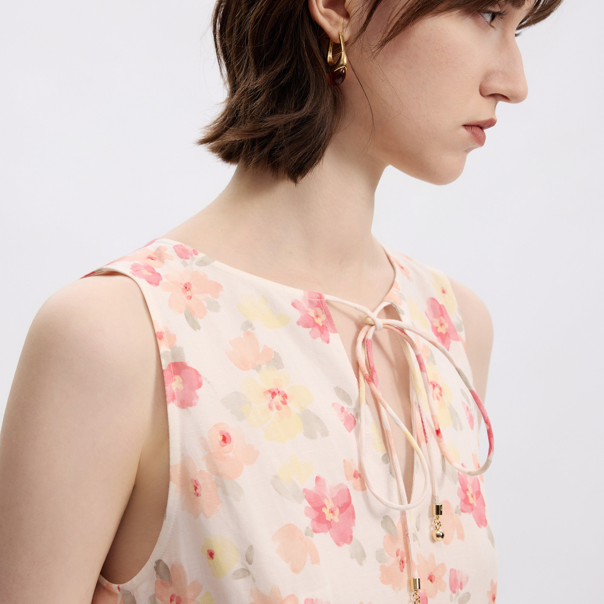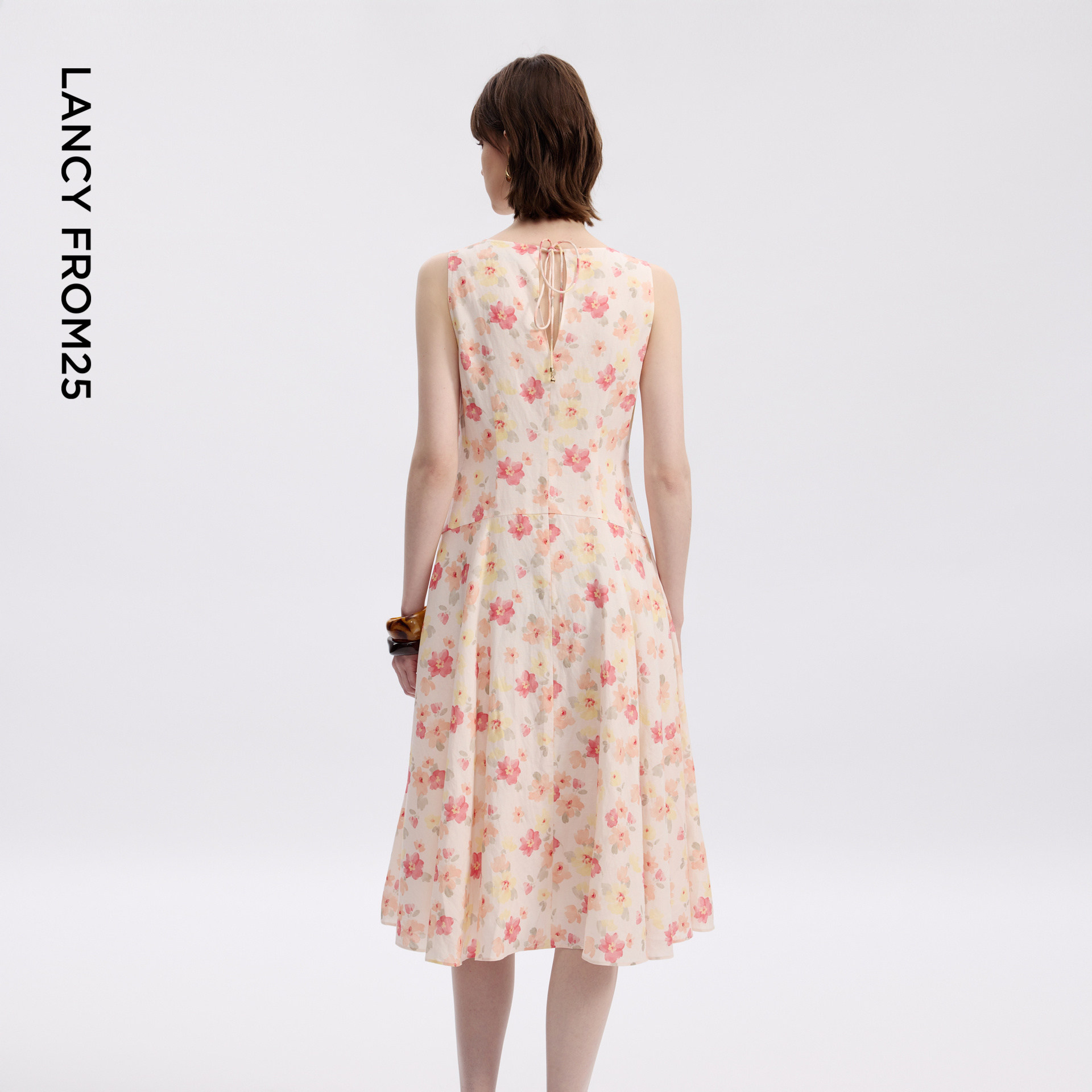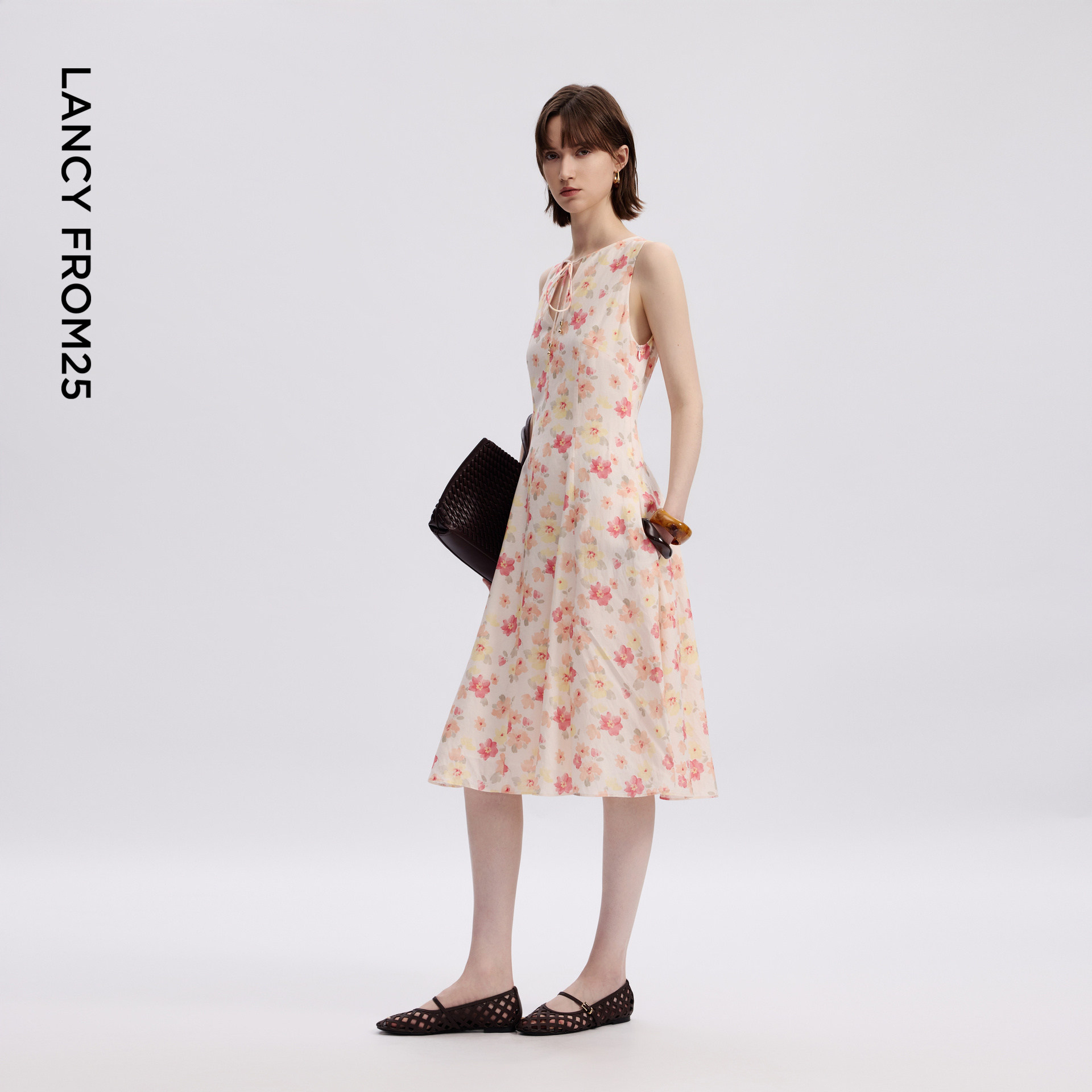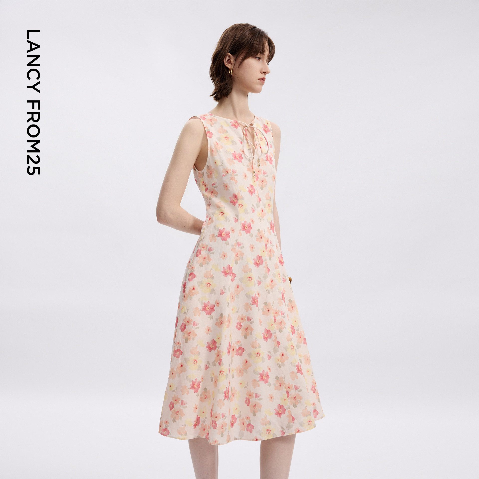 新款 收腰碎花连衣裙系带印花长裙2026年夏季 朗姿25莱赛尔A摆无袖