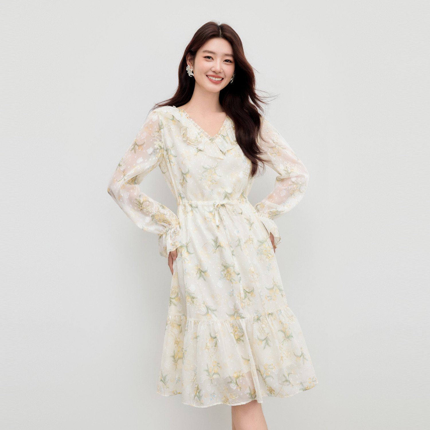 安妮不火 荷叶边连衣裙子 复古甜妹风碎花V领高腰雪纺裙女微胖大码