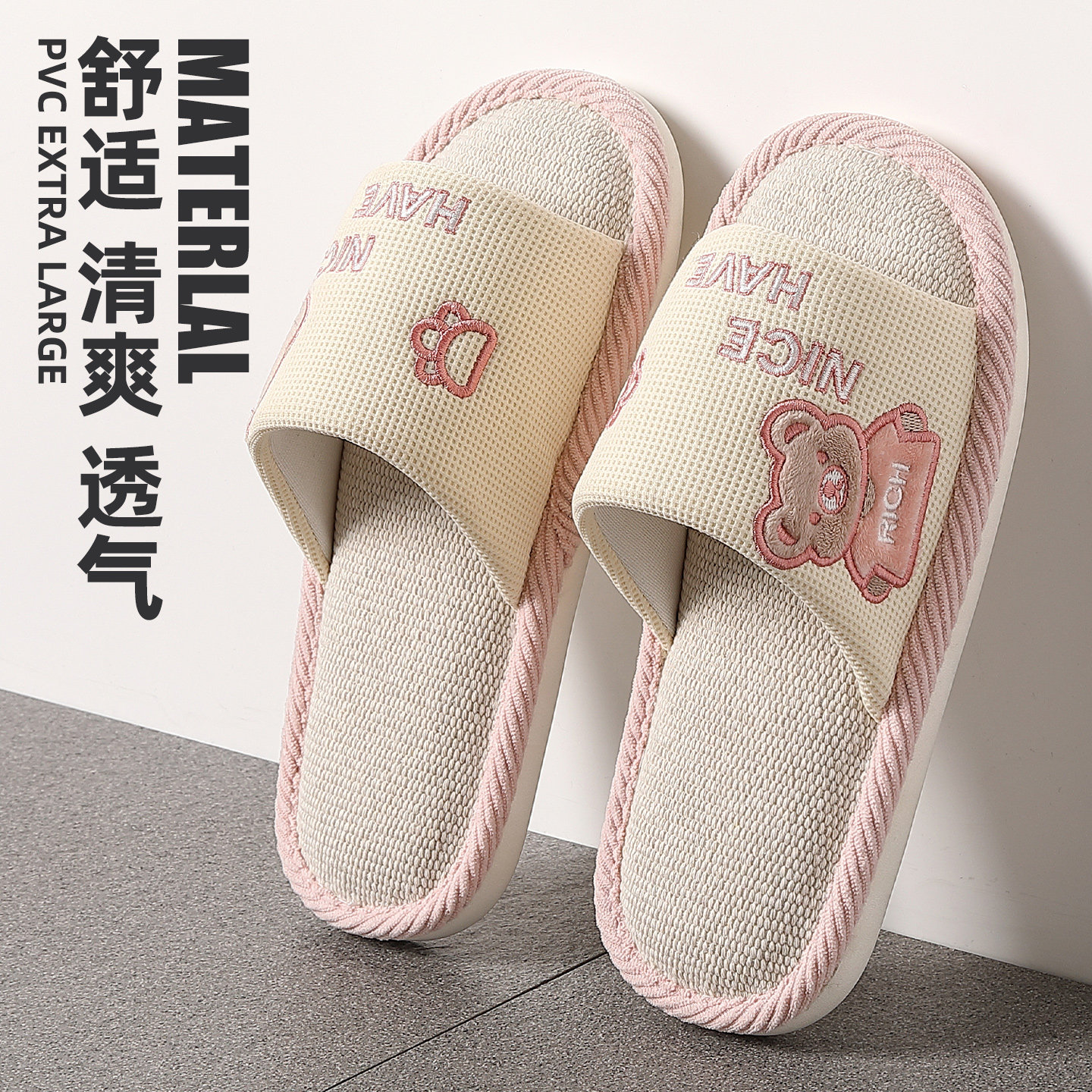 女春秋款 吸汗脚亚麻卡通可爱办公室内居家地板 通用棉麻布拖鞋 四季
