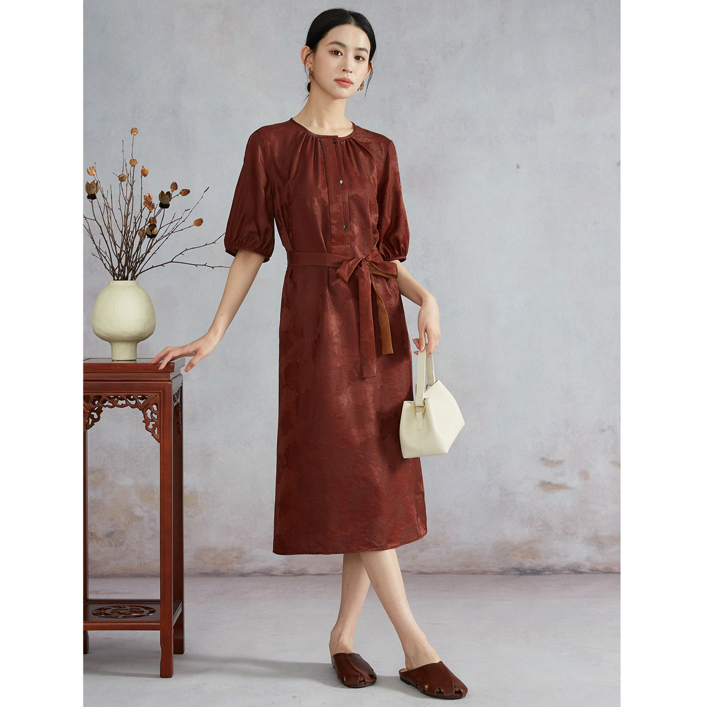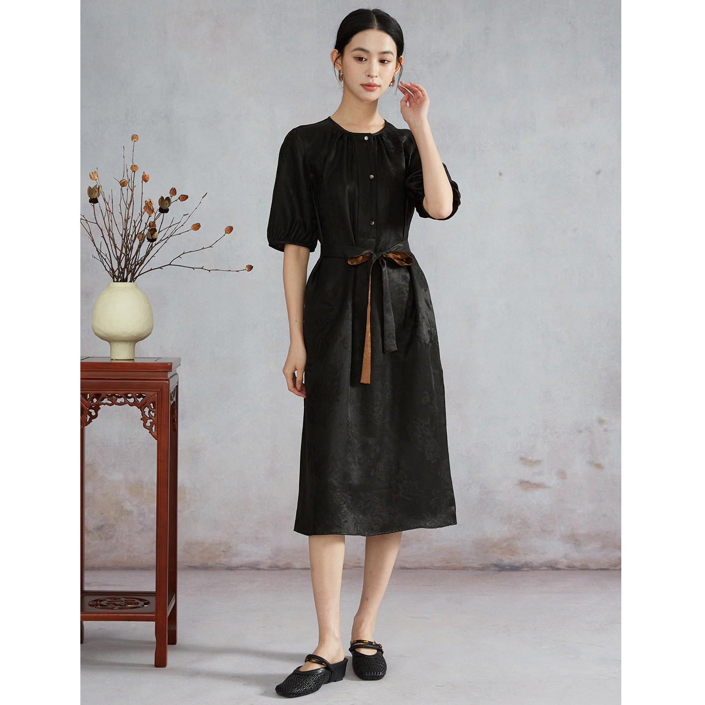 高定100%桑蚕丝香云纱国风提花真丝连衣裙女新中式 裙子夏 圆领短袖由