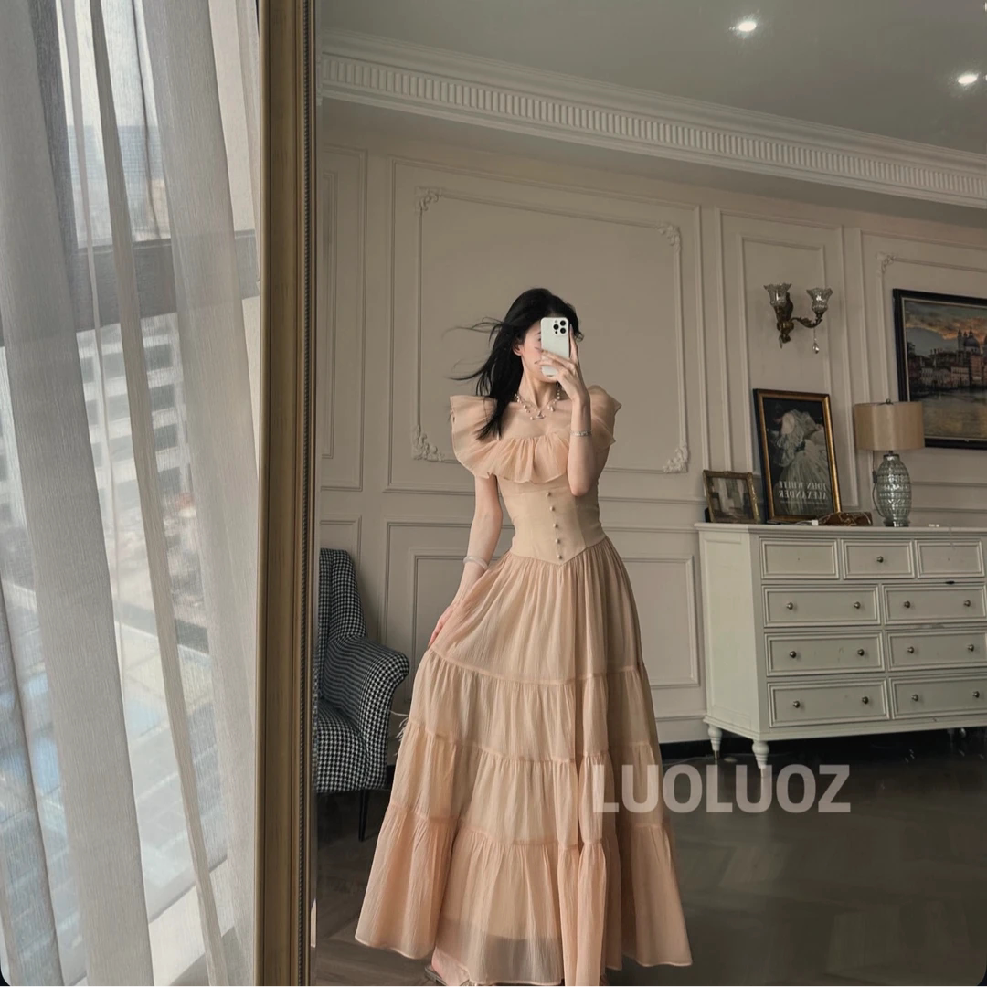 杏色方领吊带连衣裙女春法式 初恋清纯收腰裙子 miu系波点 柒月末
