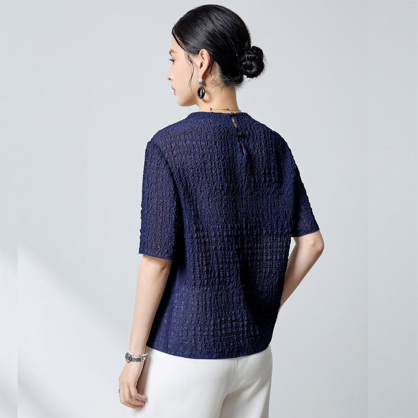 为您提供商品2026夏季 简约通勤风T恤女泡泡绉宽松五分袖 百搭气质减龄小衫 新款的详细介绍,
