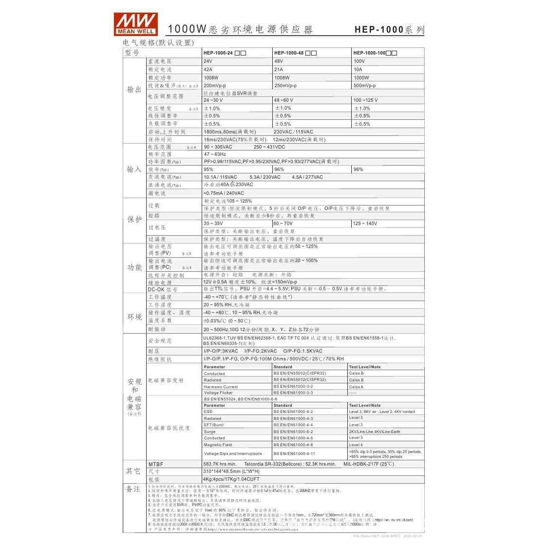 明纬LED开关电源HEP 1000 1000W驱动器带PFC 100V恒功率模式