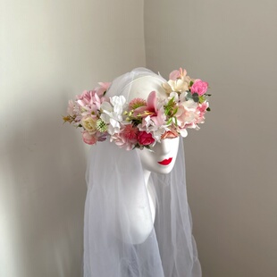 森系仙美花朵发饰 原创设计新娘头饰粉色大花朵花环甜美优雅韩式由