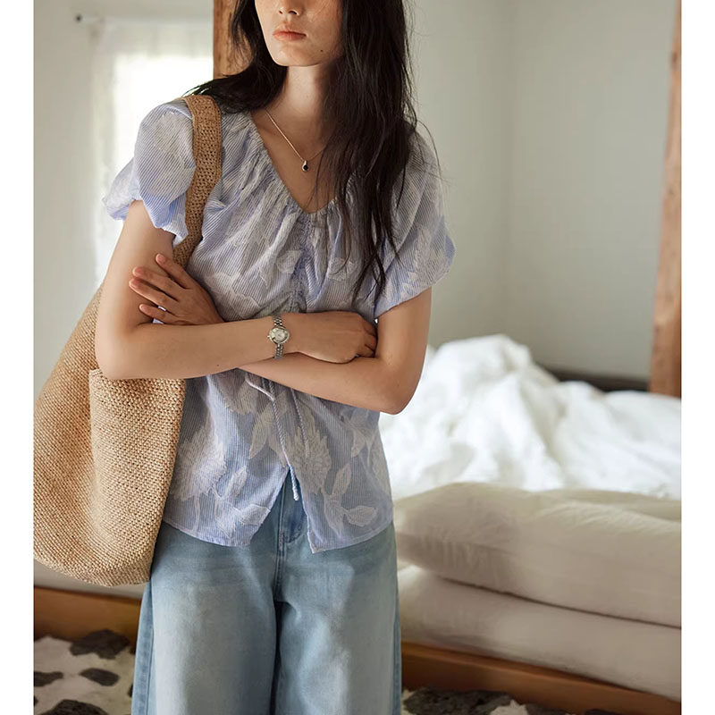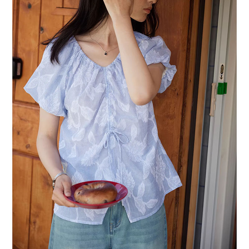 2026新款 solighter法式 复古条纹剪花v领衬衫 女夏季 系带上衣 泡泡袖由