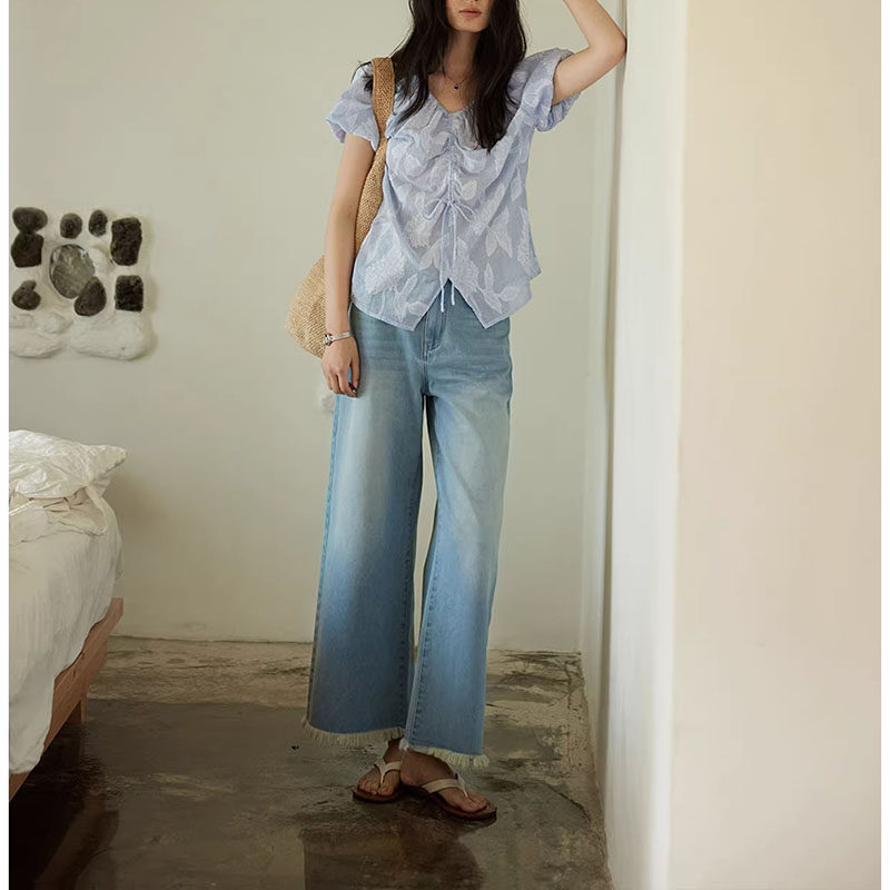 2026新款 solighter法式 复古条纹剪花v领衬衫 女夏季 系带上衣 泡泡袖
