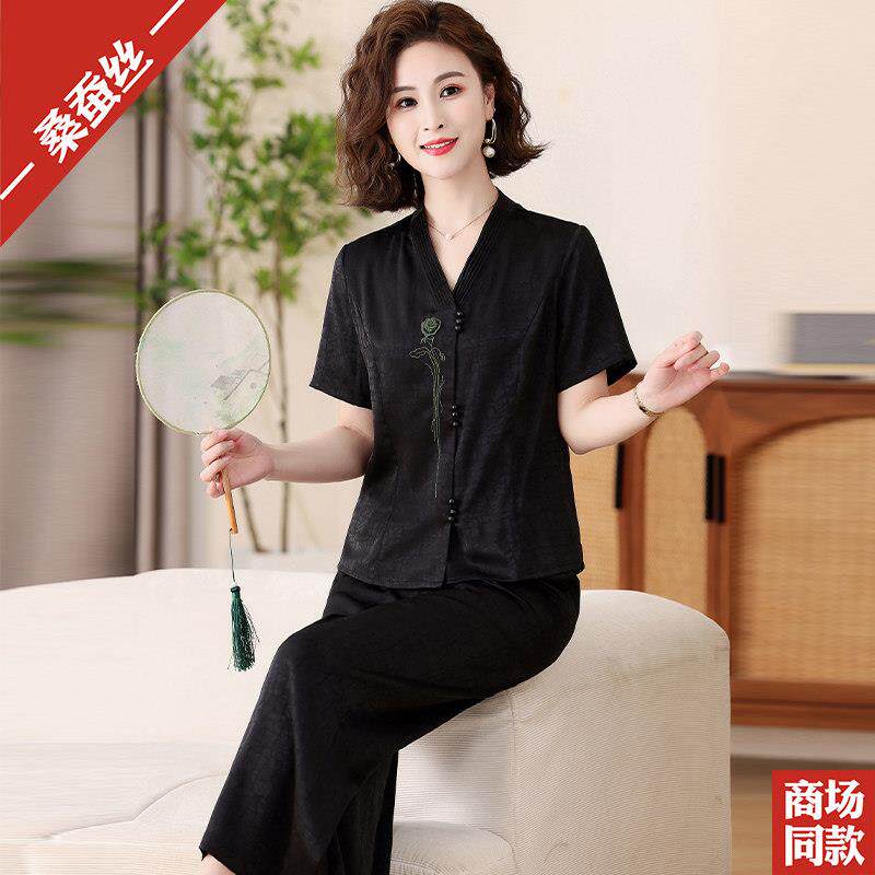 时尚 短袖 上衣气质妈妈洋派香云纱衬衫 两件套女 阔太太杭州真丝套装