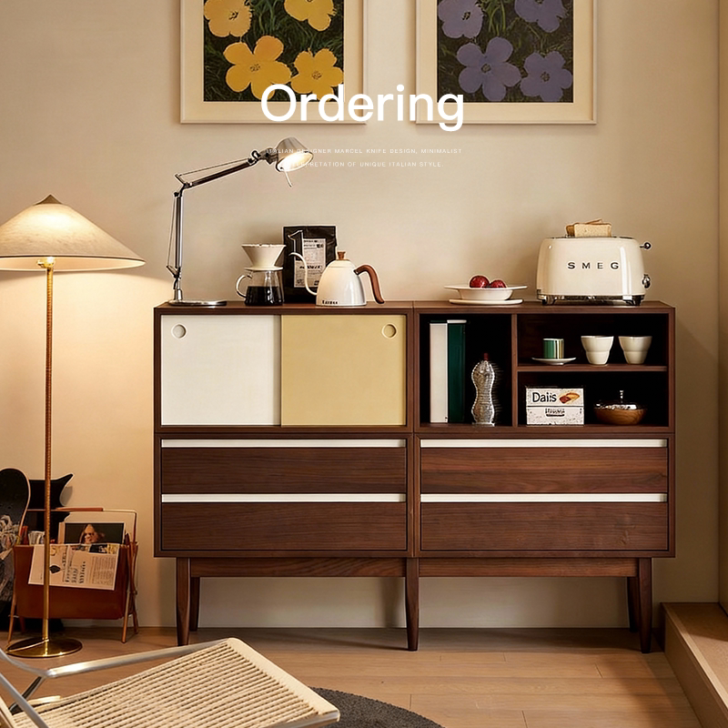 厨房置物架 餐边柜靠墙一体储物柜中古风家用客厅窄边茶水柜抽屉式