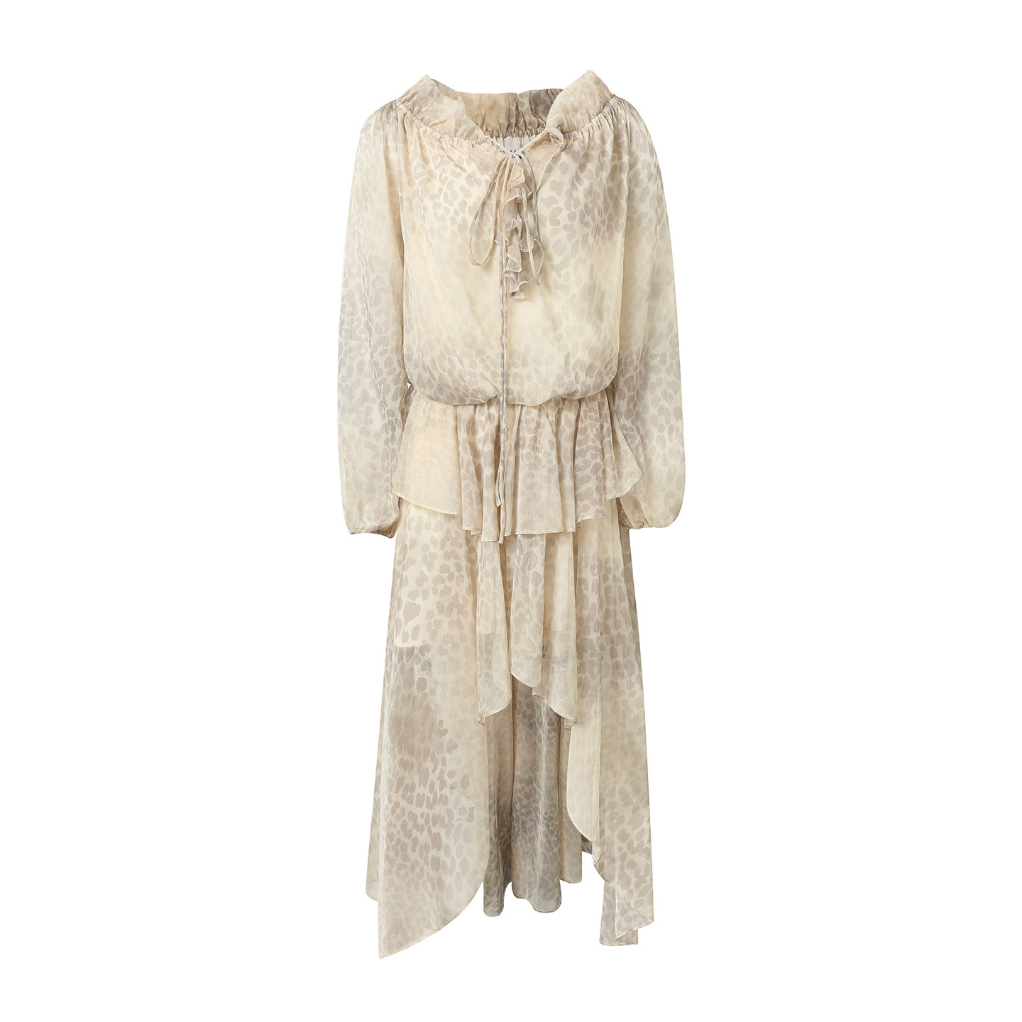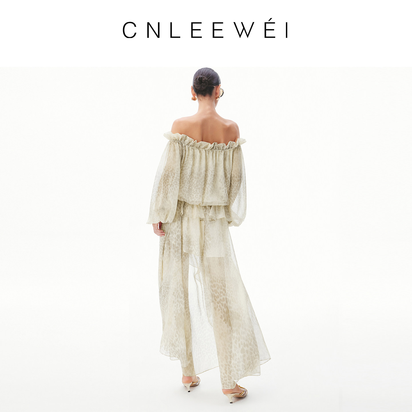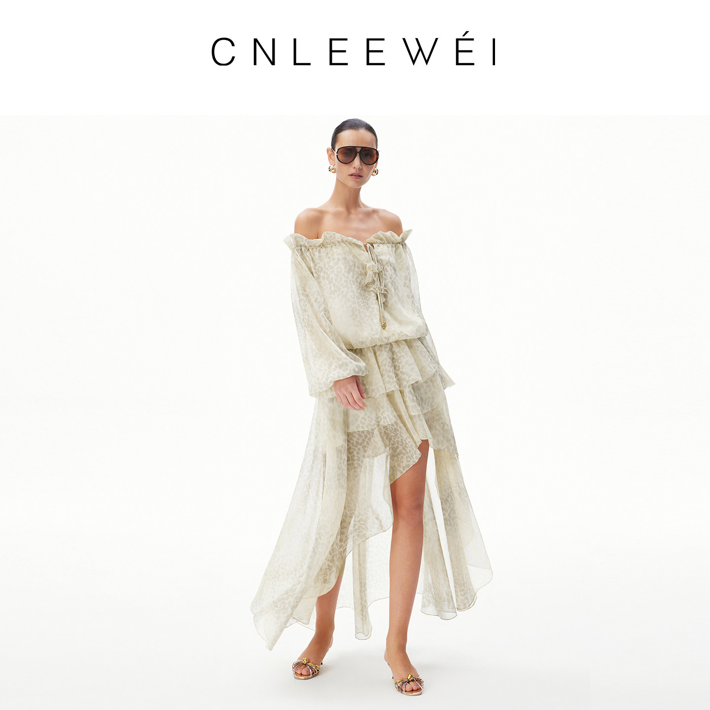 CNLEEWEI26春新款 度假风连衣裙女 女士斜肩一字肩豹纹印花泡泡袖由