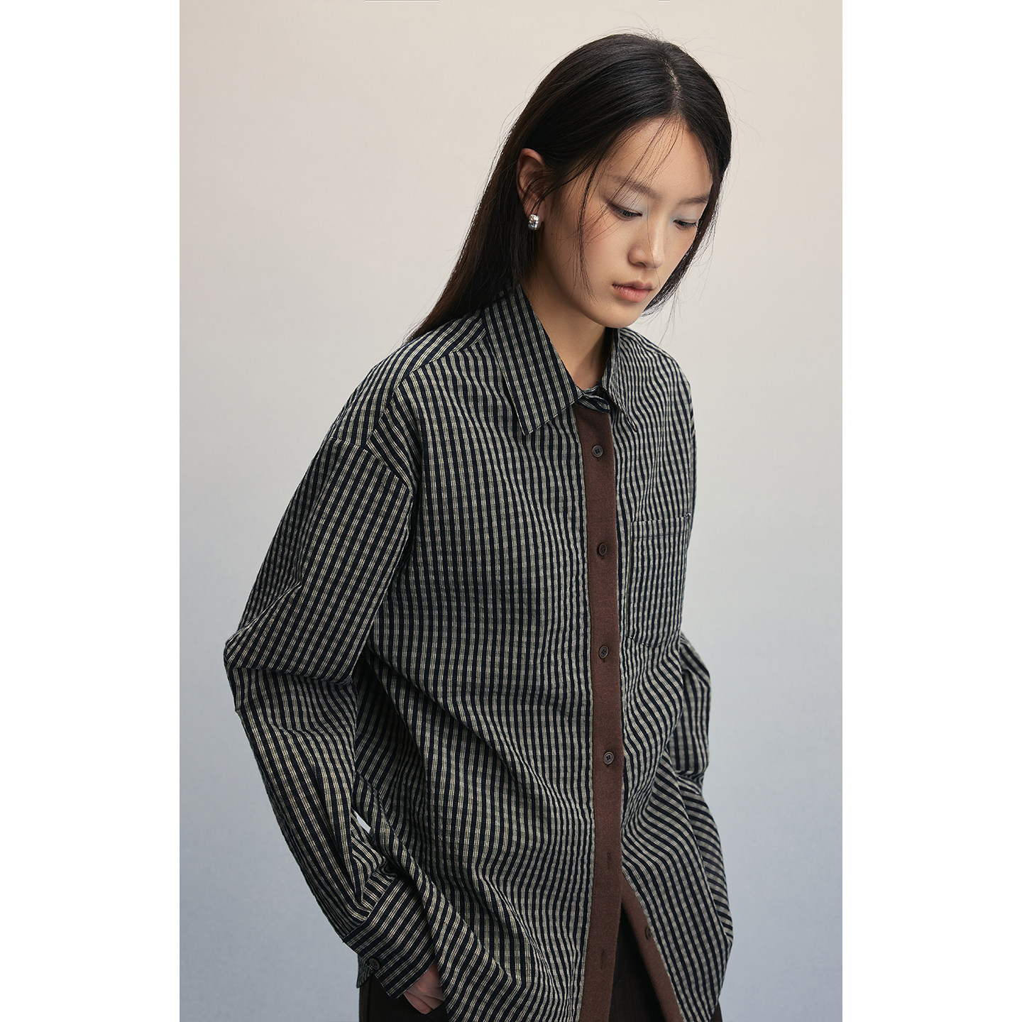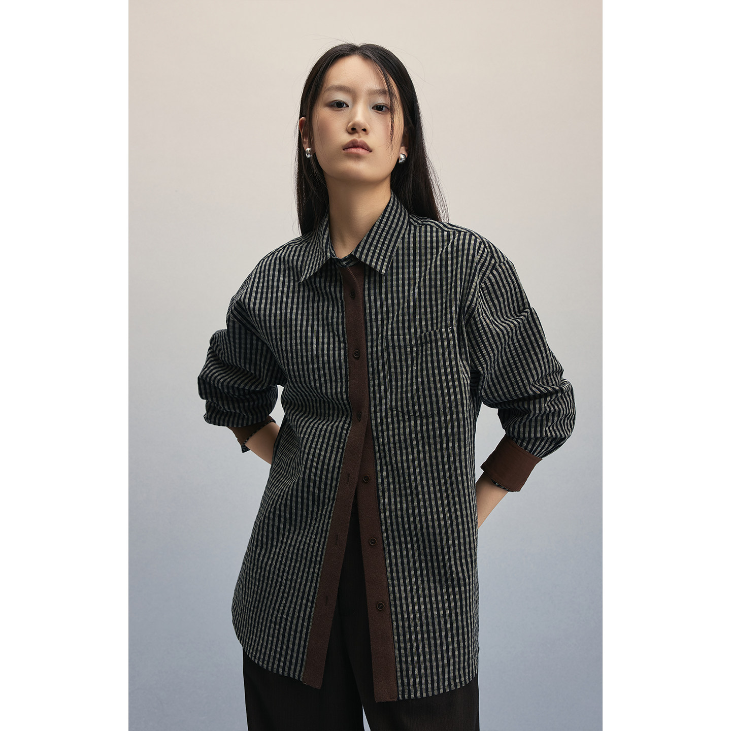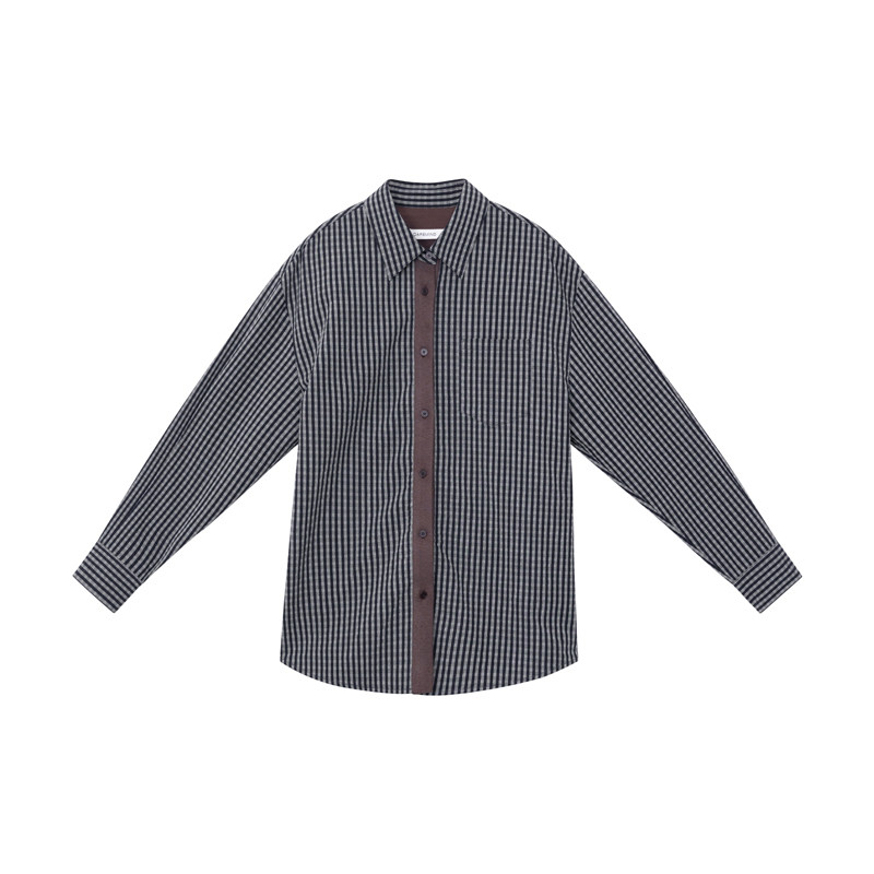 CAREMIND复古老钱撞色肌理感衬衫 宽松休闲开衫 衬衣女 黑胶唱片