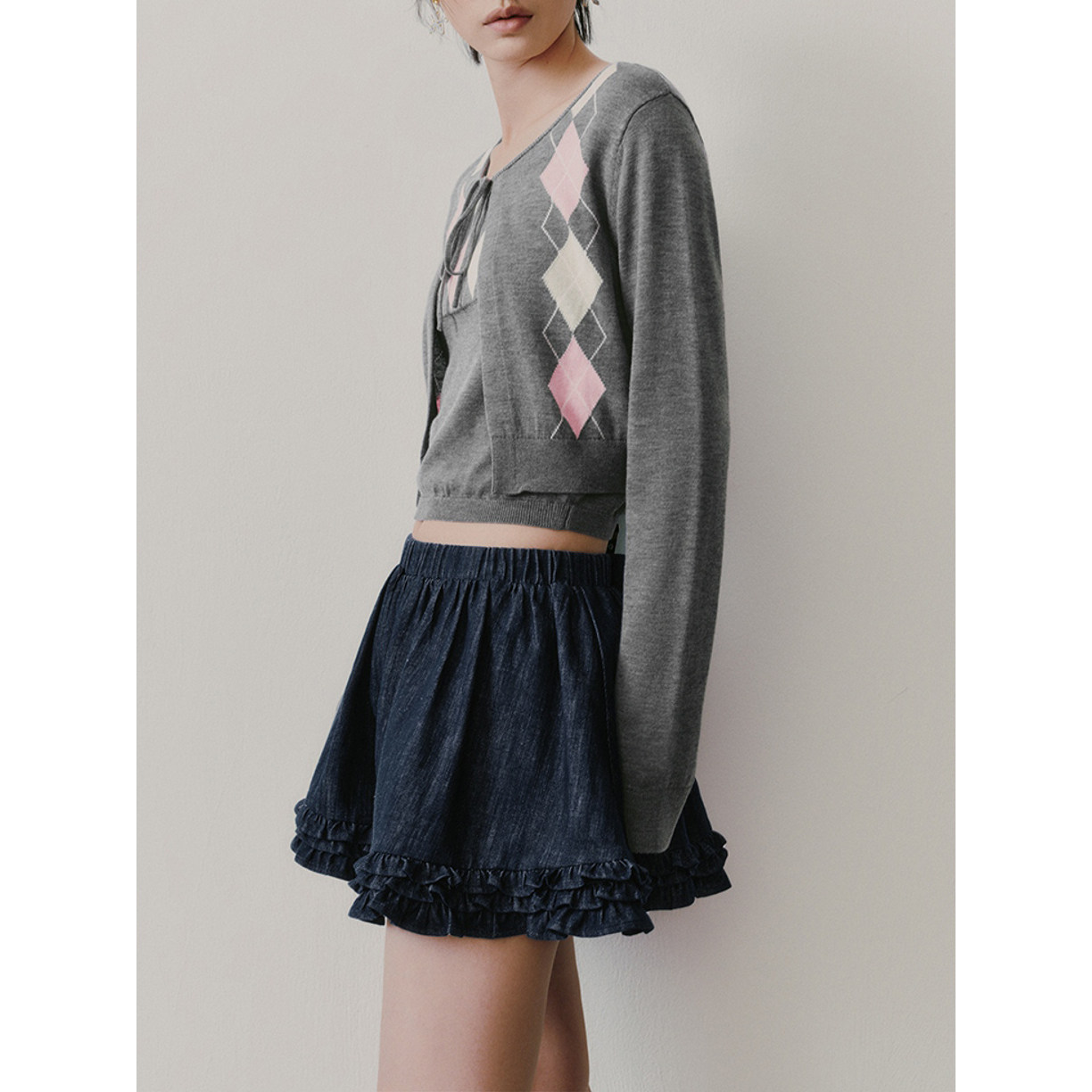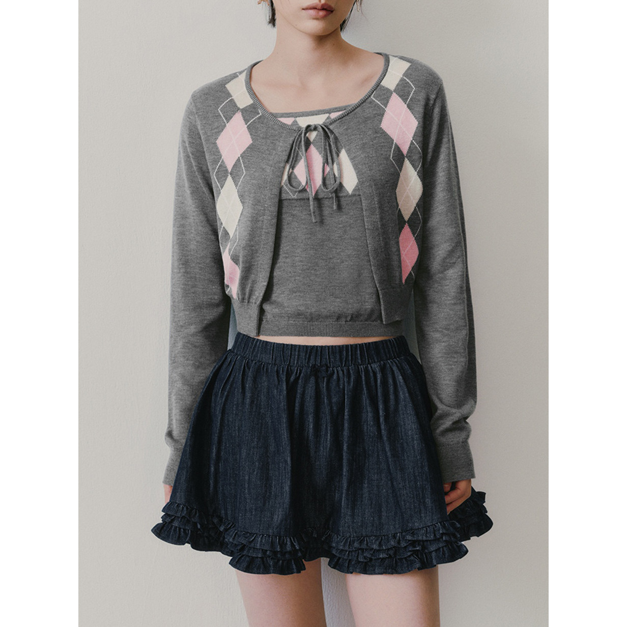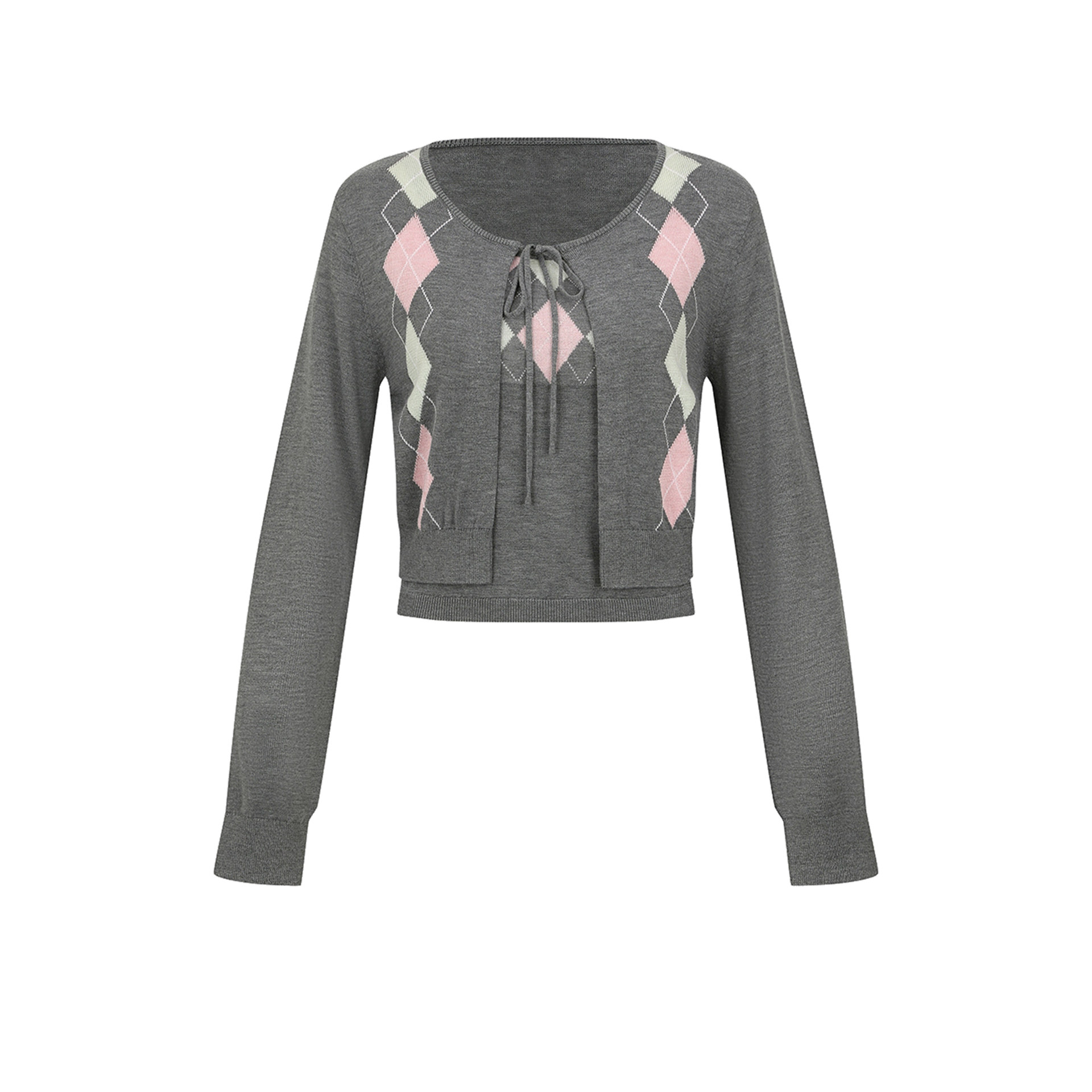 都市假两件撞色菱格修身 UR&DC2026春季 新款 时尚 女短上衣 针织开衫