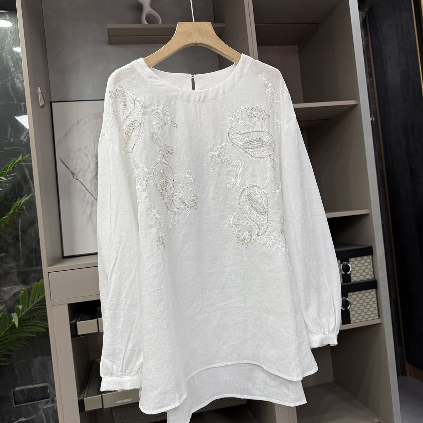 上衣女 P牌订单 宽松亚麻钉珠刺绣圆领长袖 衬衫 AE0538由