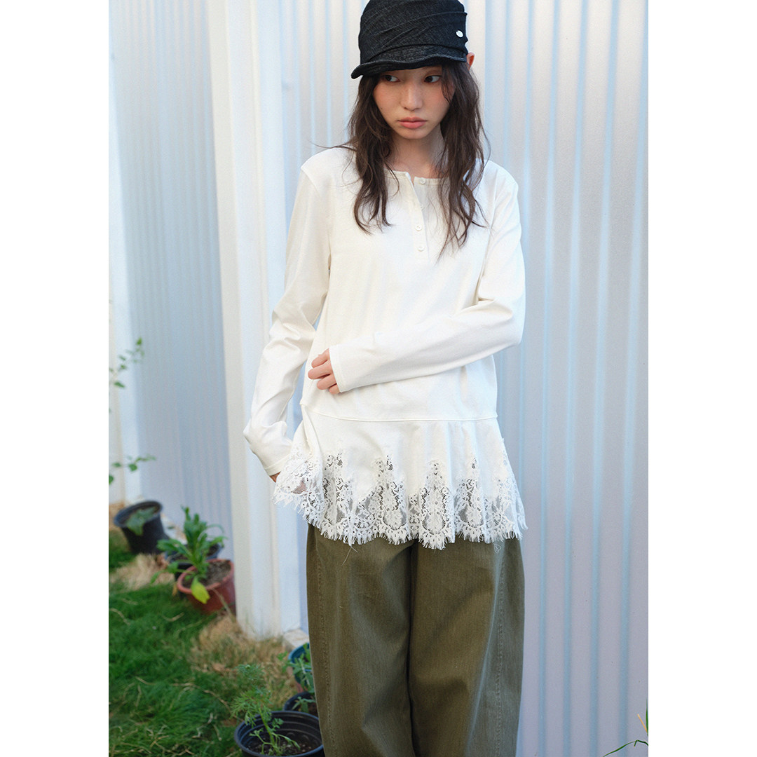 BLUEerror t恤女花边叠穿打底衫 春季 上衣 蕾丝拼接白色圆领长袖由