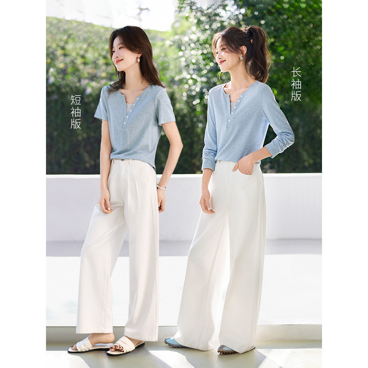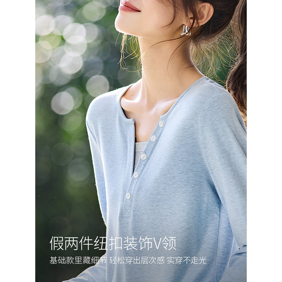 为您提供商品沫晗依美休闲百搭撞色拼接假两件T恤2026夏新款 清凉透气显瘦长袖的详细介绍,