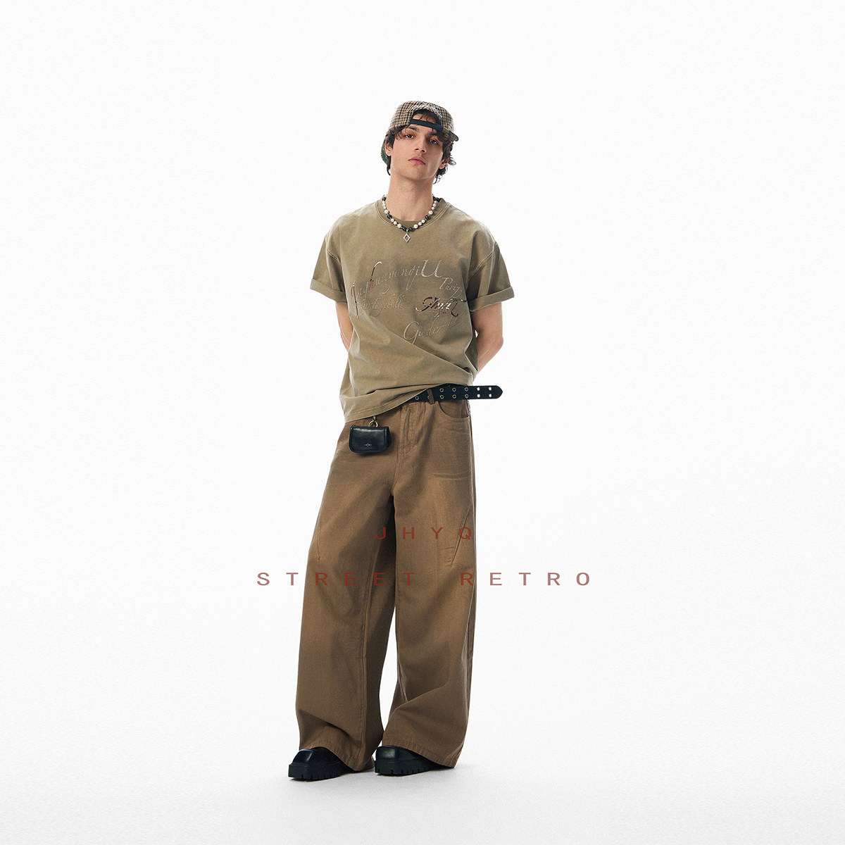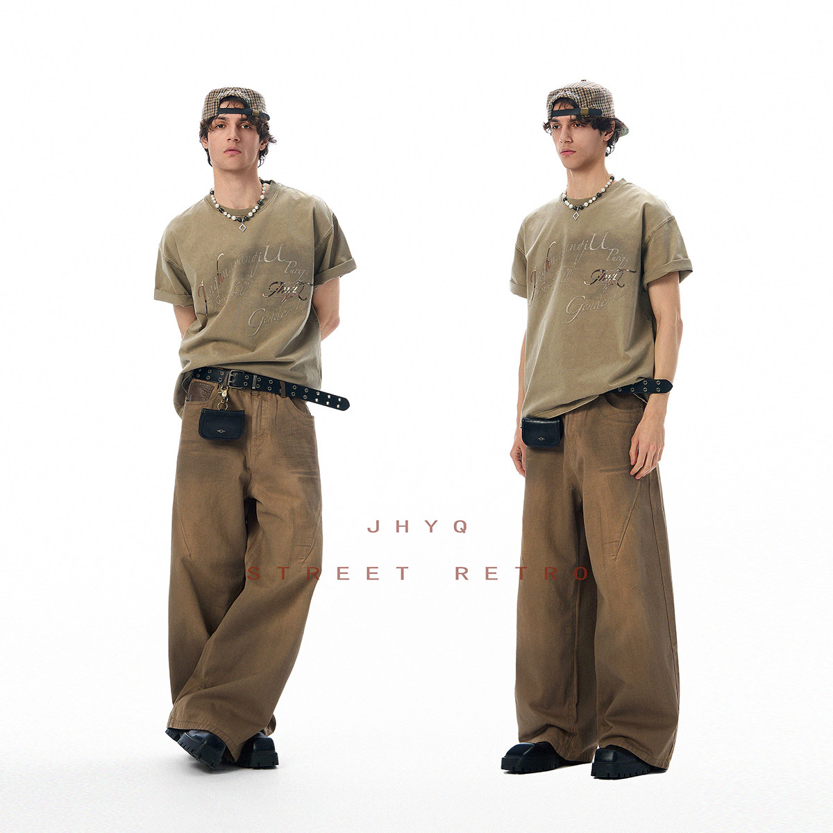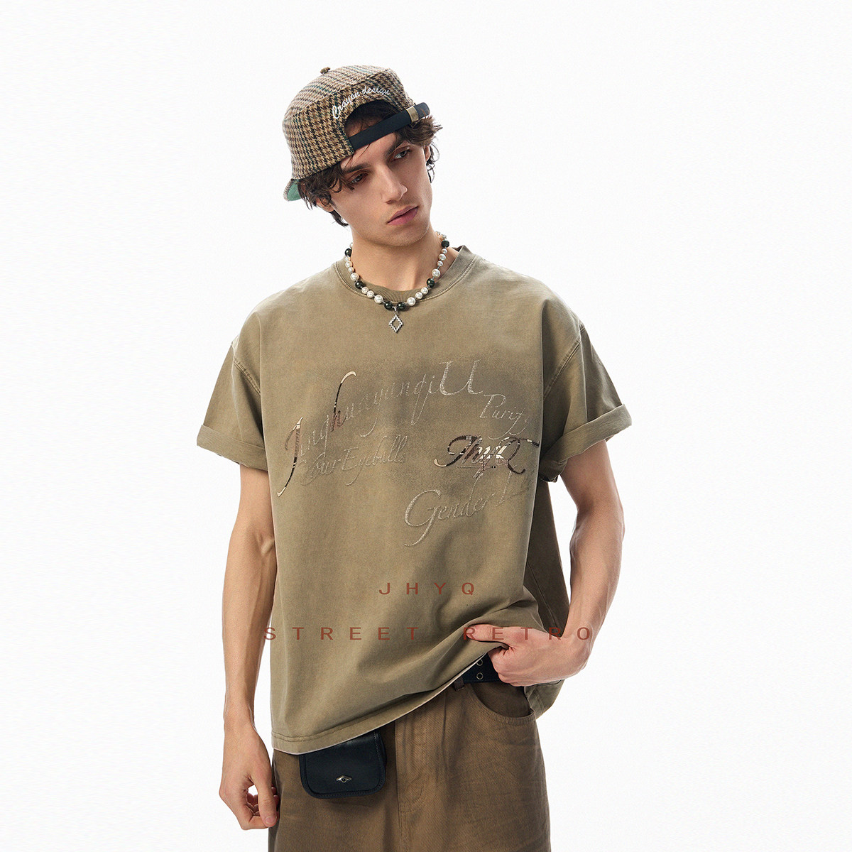 JHYQ美式 T恤男宽松潮牌纯棉复古上衣 280g字母立体烫印花水洗短袖