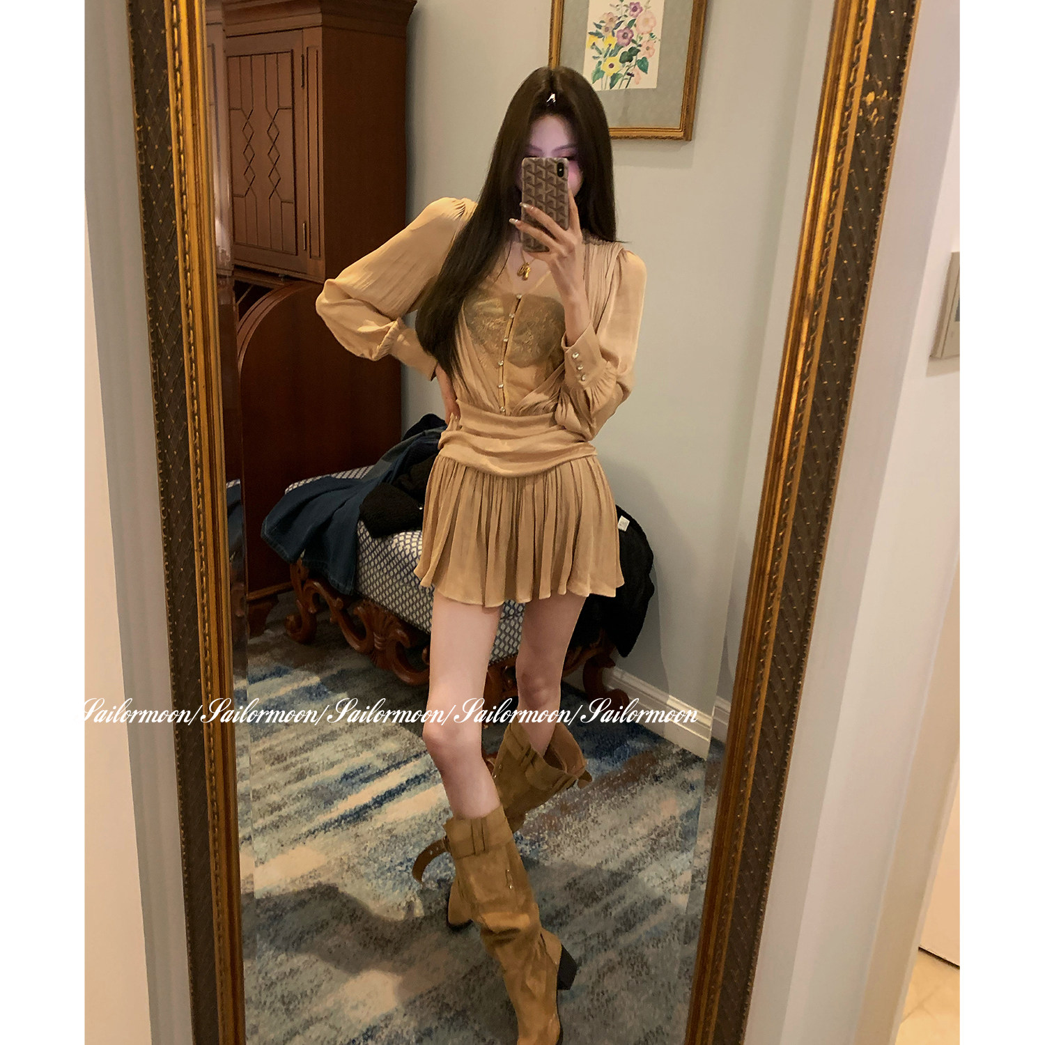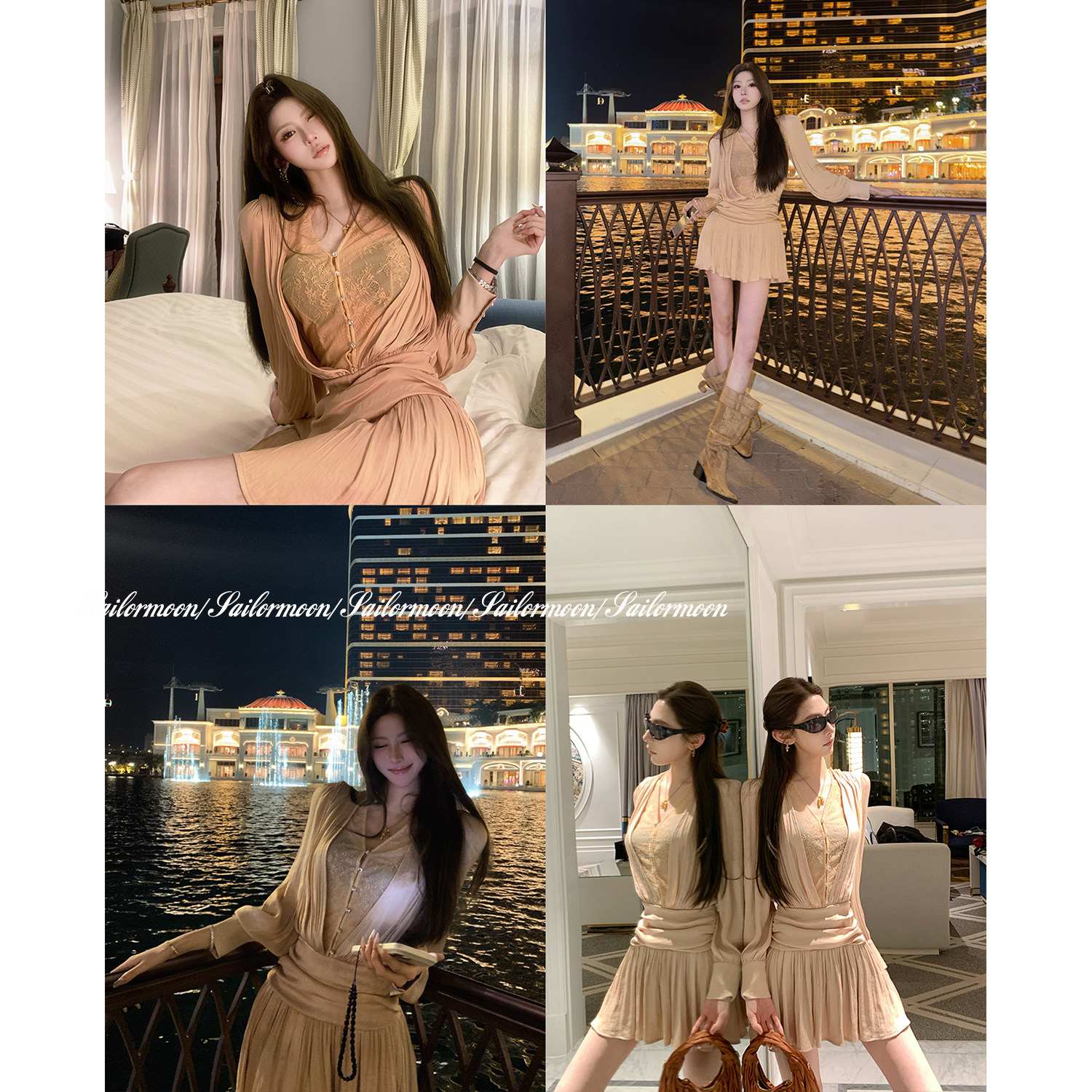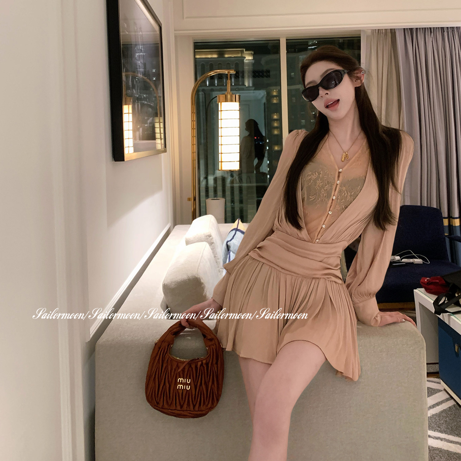 直播 新款 挂脖长袖 杏色蕾丝连衣裙显瘦短裙 春装