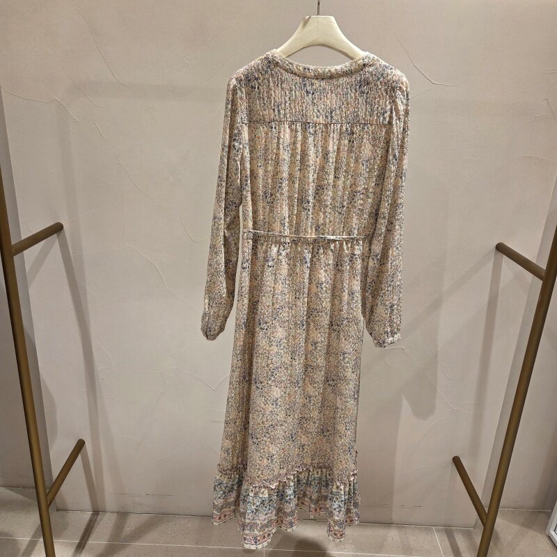 酒午自制 优雅复古春季 斜领露肩连衣裙修身 侧开叉长裙 浅绯花影